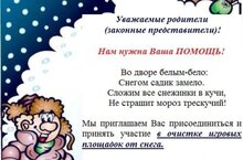 Уважаемые родители! Обращаемся к Вам с просьбой о помощи по уборке снега! В любое свободное и удобное для Вас время приглашаем принять участие в добровольной акции "Доброе дело!" Мы благодарим родителей, которые уже активно помогают нам в расчистке территории от снежных заносов!