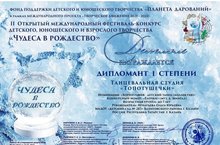 Поздравляем танцевальную студию "Топотушечки" с I степенью во II Открытом международном фестиваль-конкурсе детского, юношеского и взрослого творчества "Чудеса в Рождество" в номинации "Хореография - детский танец (Коллектив)". Руководитель Игатьева Ольга Юрьевна. Молодцы!!!