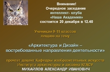 Очередное заседание интеллект- клуба «Наша Академия» состоится 20 декабря в 12.40 «Архитектура и Дизайн – востребованные направления деятельности» прочтёт доцент Кафедры изобразительных искусств Института архитектуры и дизайна КГАСУ