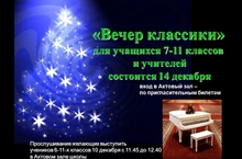 «Вечер классики» для учащихся 7-11 классов и учителей состоится 14 декабря. Прослушивание желающих выступить учеников 6-11-х классов 10 декабря с 11.45 до 12.40 в Актовом зале школы.
