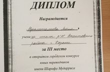 На ежегодном открытом городском конкурсе юных переводчиков имени Ш. Мударриса, финал которого прошел 7 апреля 2016г на базе Института филологии и межкультурной коммуникации КФУ, ученица нашей школы, Мухаматгалиева Лейла, заняла призовое, 3 место. Поздравляем Лейлу и учителей, подготовивших ее к конкурсу, А. Р. Уразметову, С. М. Садикову. Желаем дальнейших творческих успехов!