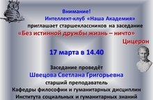 Внимание! Интеллект-клуб «Наша Академия» приглашает старшеклассников на заседание «Без истинной дружбы жизнь – ничто» 17 марта в 14.40. Заседание проведёт Швецова Светлана Григорьевна старший преподаватель кафедры философии и гуманитарных дисциплин Института социальных и гуманитарных знаний