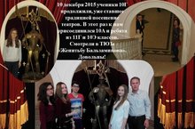 10 декабря 2015 ученики 10Г продолжили, уже ставшее традицией посещение театров. В этот раз к нам присоединился 10А и ребята из 11Г и 10Э классов. Смотрели в ТЮЗе «Женитьбу Бальзаминова». Довольны!