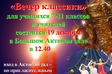 «Вечер классики» для учащихся 7-11 классов и учителей состоится 19 декабря в Большом Актовом зале в 12.40