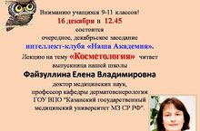 Лекцию на тему «Косметология» читает выпускница нашей школы Файзуллина Елена Владимировна доктор медицинских наук, профессор кафедры дерматовенерологии ГОУ ВПО "Казанский государственный медицинский университет МЗ СР РФ". -