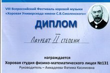 Поздравляем хоровую студию лицея и их руководителя Ахмадееву Фатиму Касимовну с успешным выступлением на VIII Всероссийском фестивале хоровой музыки "Хоровая Универсиада имени С.В.Смоленского"!