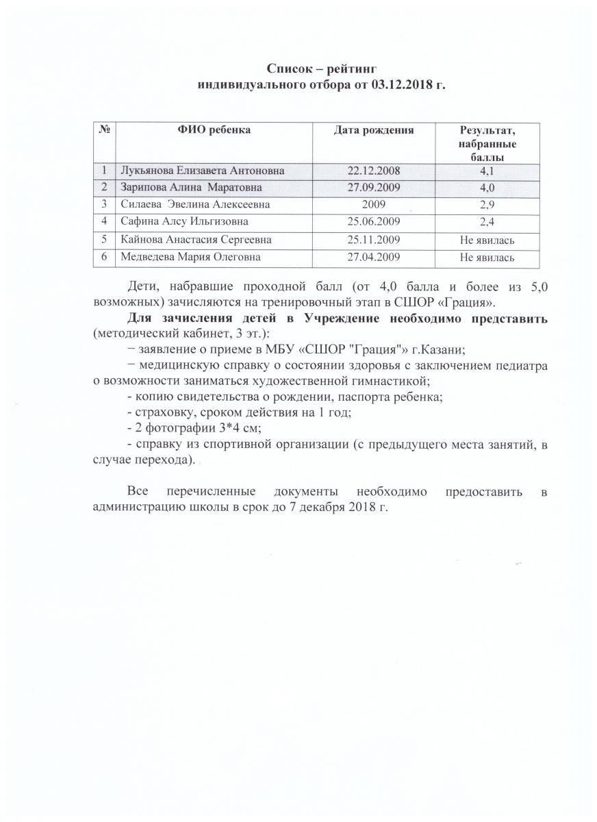 Список-рейтинг индивидуального отбора от 03.12.2018 г.
