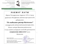 Учитель татарского языка и литературы Савдаханова Эмма.Булатовна и коллектив кадет награждены благодарственным письмом Министерства культуры РТ за активное участие в конкурсе творческих работ , посвященном 125 - летию со дня рождения великого татарского драматурга, актера и режиссера Карима Тинчурина.