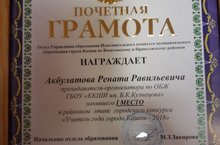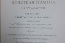 Почетная грамота за подготовку победителя в республиканской олимпиаде для обучающихся кадетских общеобразовательных организации.