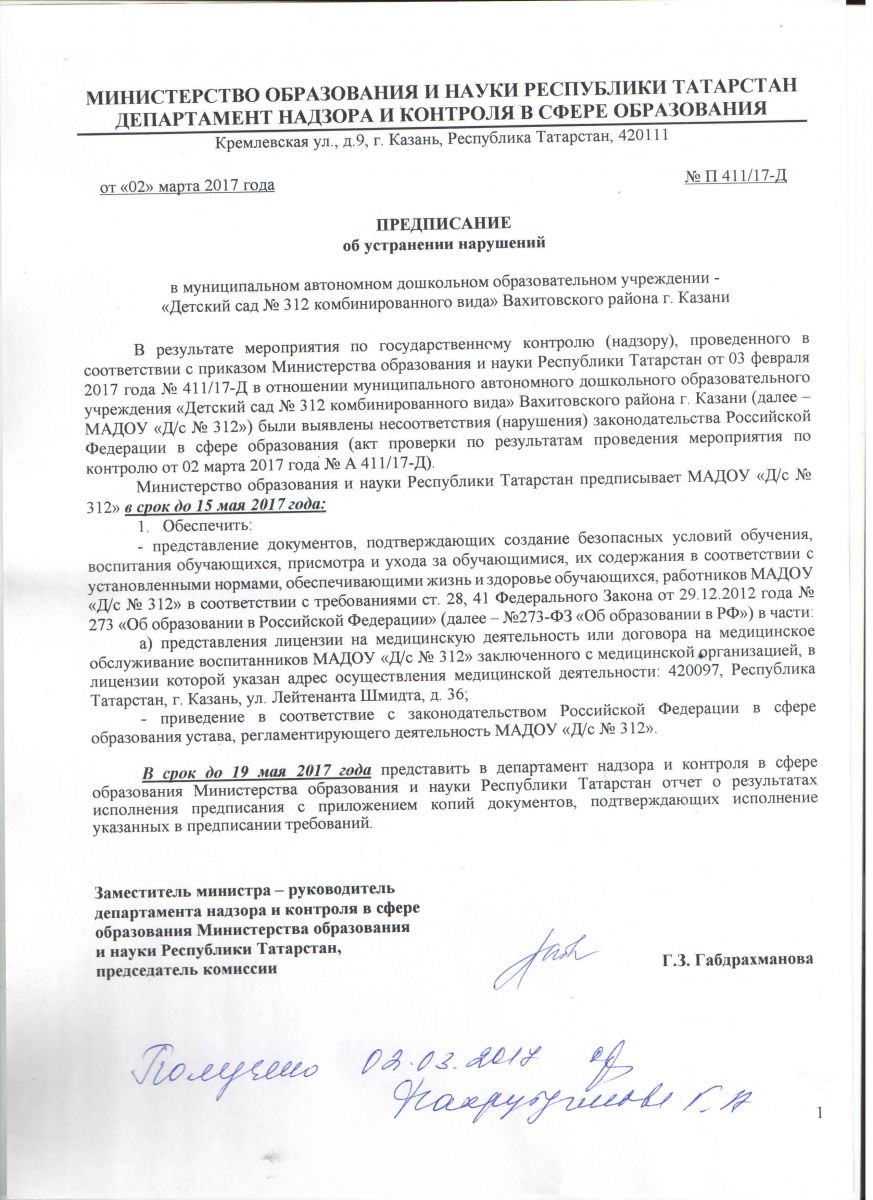 Предписание Департамента надзора и контроля в сфере образования МОиН РТ об устранении нарушений от 02.03.2017г