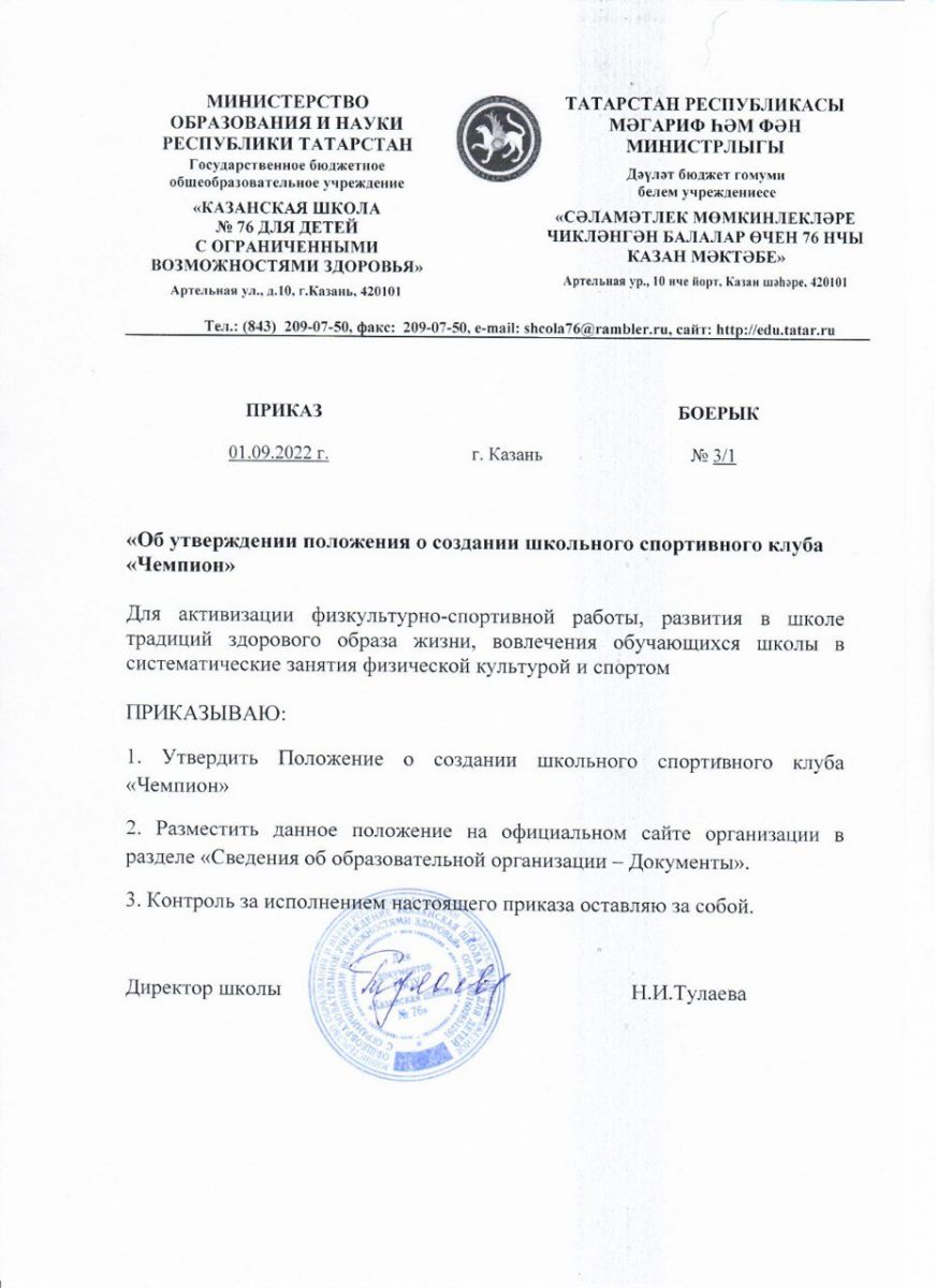 Приказ "Об утверждении положения о создании школьного спортивного клуба "Чемпион"