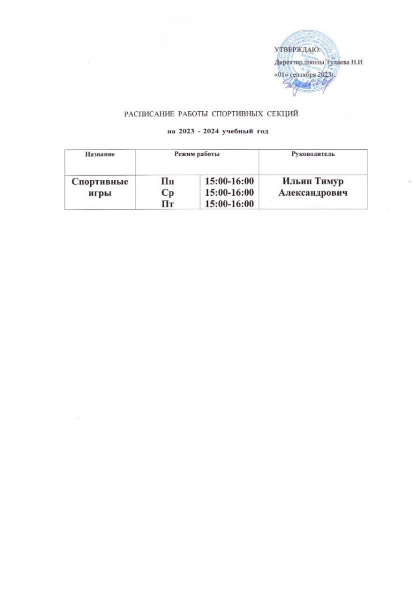 Расписание работы спортивных секций на 2023-2024 учебный год