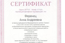 Поздравляем Анну Ференец, ученицу 11Б класса, которая приняла участие в образовательной программе "Литературное творчество", успешно выполнила и защитила несколько работ.