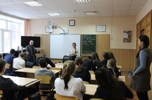 В рамках сотрудничества школы с КУОО состоялась встреча с преподавателем гражданского права юридического факультета К(П)ФУ, адвокатом Лукиным Юрием Михайловичем. Совместно с 9Г классом (классный руководитель Абсалямова И. Х. , зам.директора по ВР Давиденко С.В.) провели ролевую игру по теме «Правовое явление в литературных произведениях» доводы вышли за пределы предлагаемой фабулы. Умение выступать и глубина мышления – основа данной встречи.