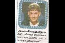 Знаете ли вы, что в нашем городе живут самые умные и талантливые личности? В №51 газеты ВаБанкъ рассказали о казанцах, добившихся признания в России и мире. Семь казанцев, ставших лучшими в своих профессиональных областях. Одним из них стал Станислав Шипачев, студент (выпускник 39 школы), в 2011 году стал абсолютным чемпионом Золотой лиги в телеигре "Самый умный"
