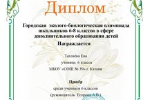 Поздравляем Тегеневу Еву, ученицу 6а класса, которая стала призером Городской открытой эколого-биологической олимпиады в сфере дополнительного образования!