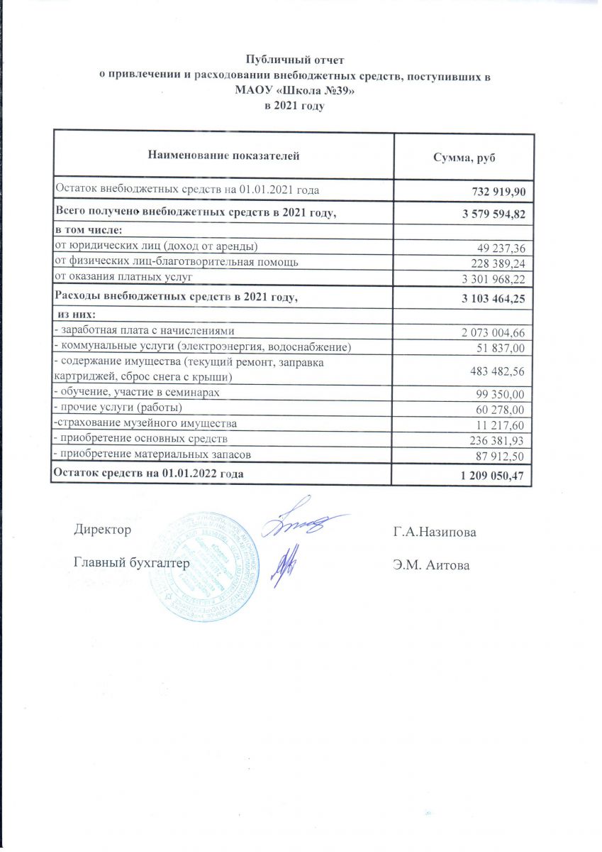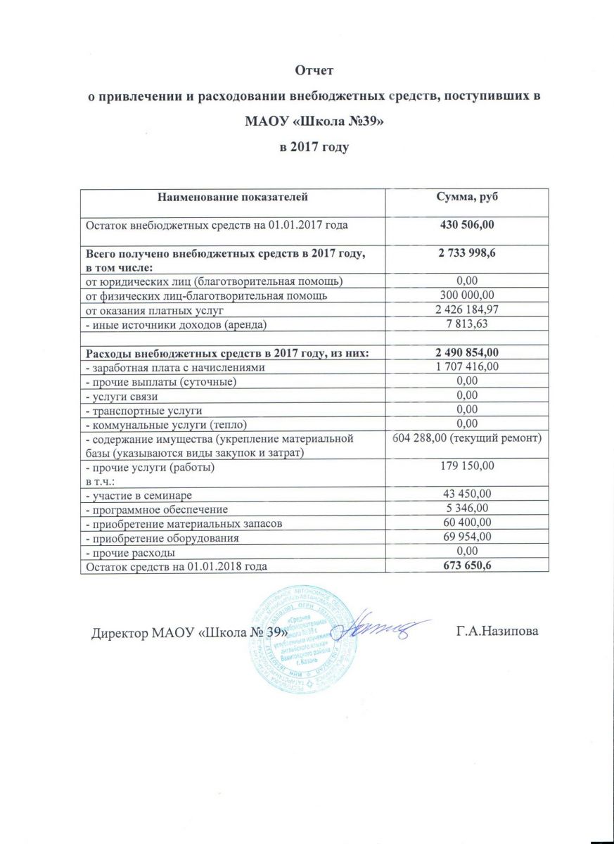 Отчет о привлечении и расходовании внебюджетных средств, поступивших в МАОУ «Школа №39» в 2018 году