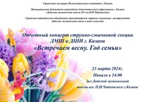 23 марта 2024 года в 14.00 в Концертном зале Детской музыкальной школы №1 им.П.И.Чайковского состоится Отчётный концерт струнно-смычковой секции ДМШ и ДШИ г.Казани "Встречаем весну. Год семьи".