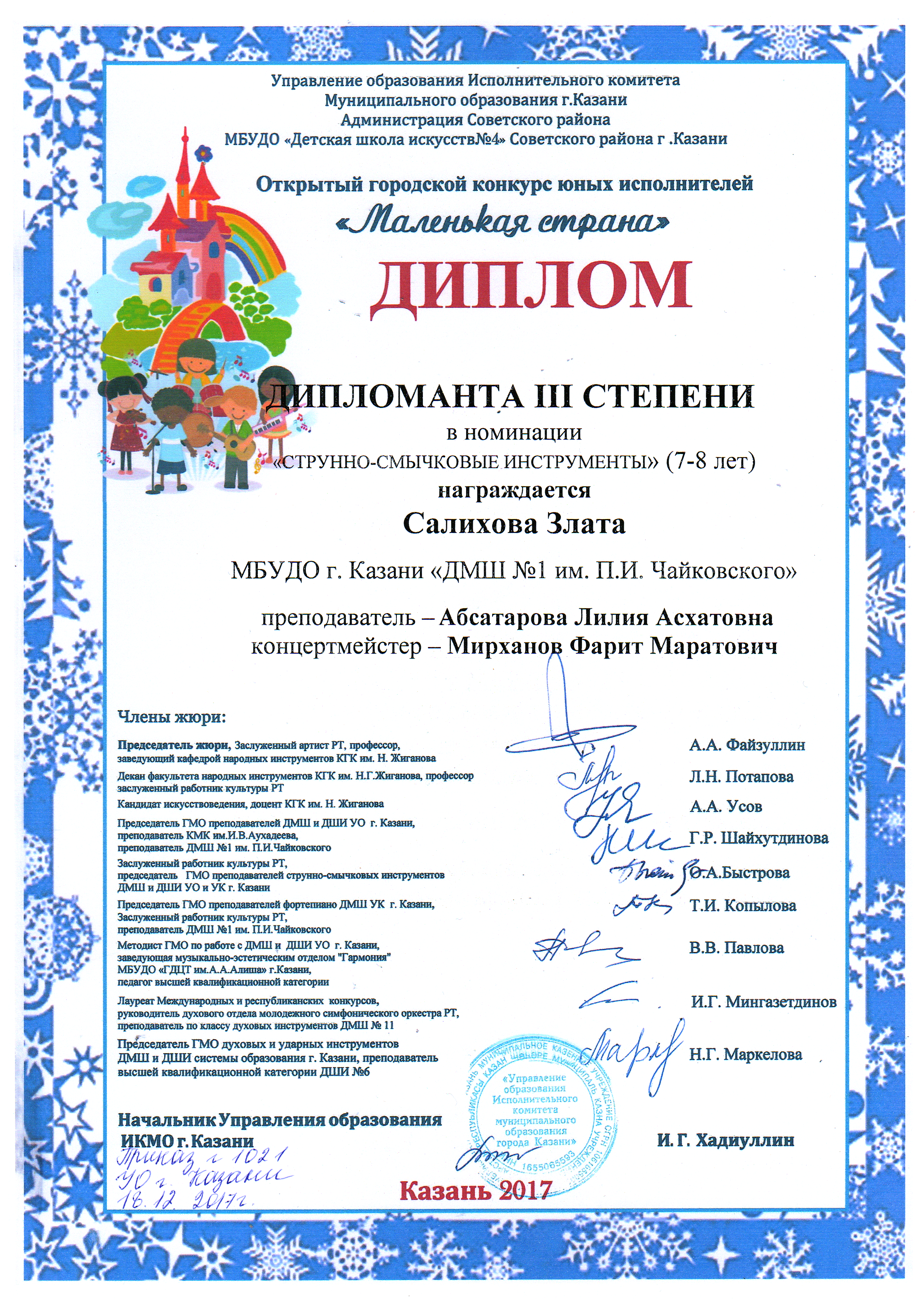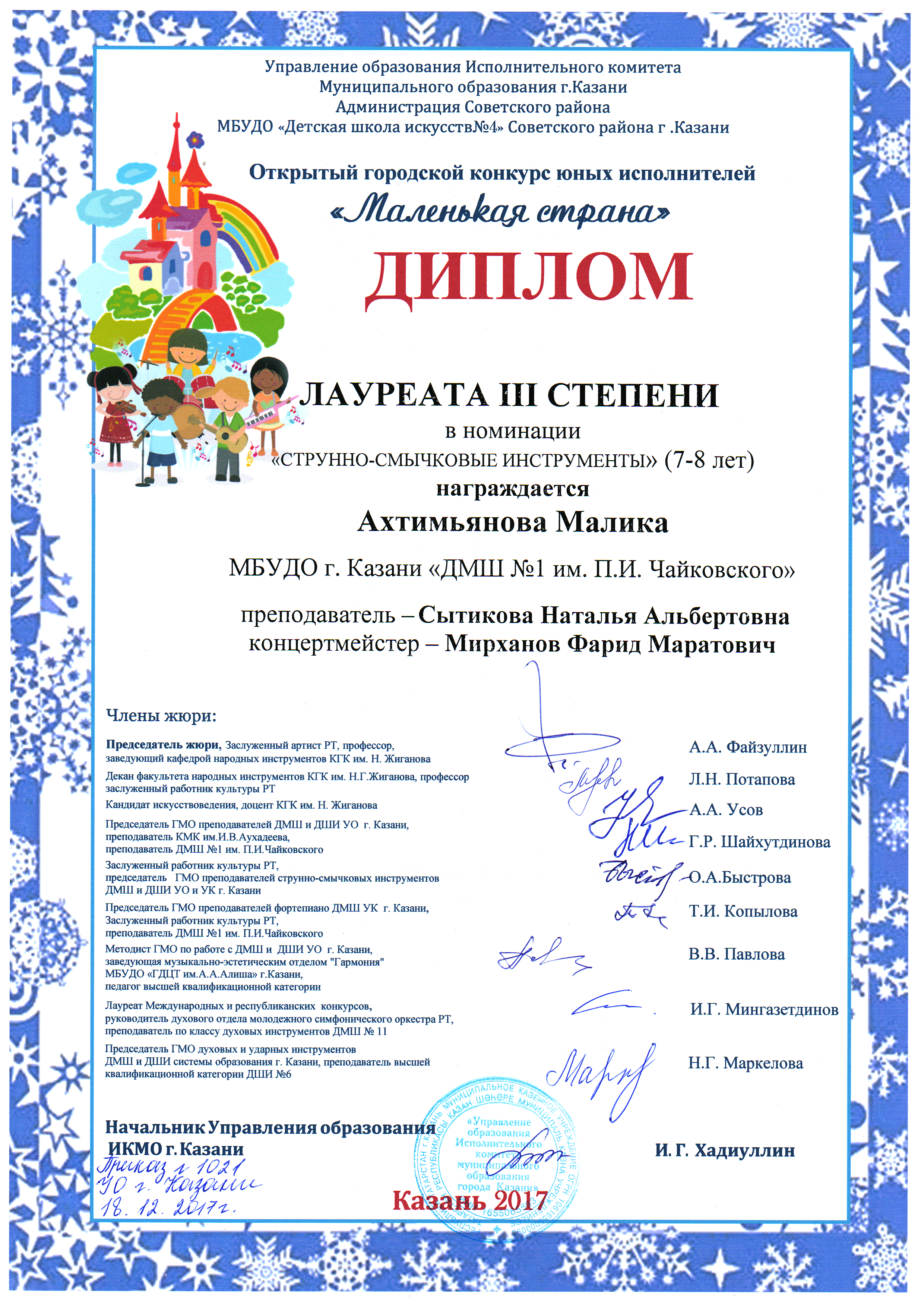 Городской фестиваль секции струнно-смычковых инструментов г.Казани "Мы дети твои, Земля", посвящённый Году экологии - Шмакова Милена, Диплом участника;