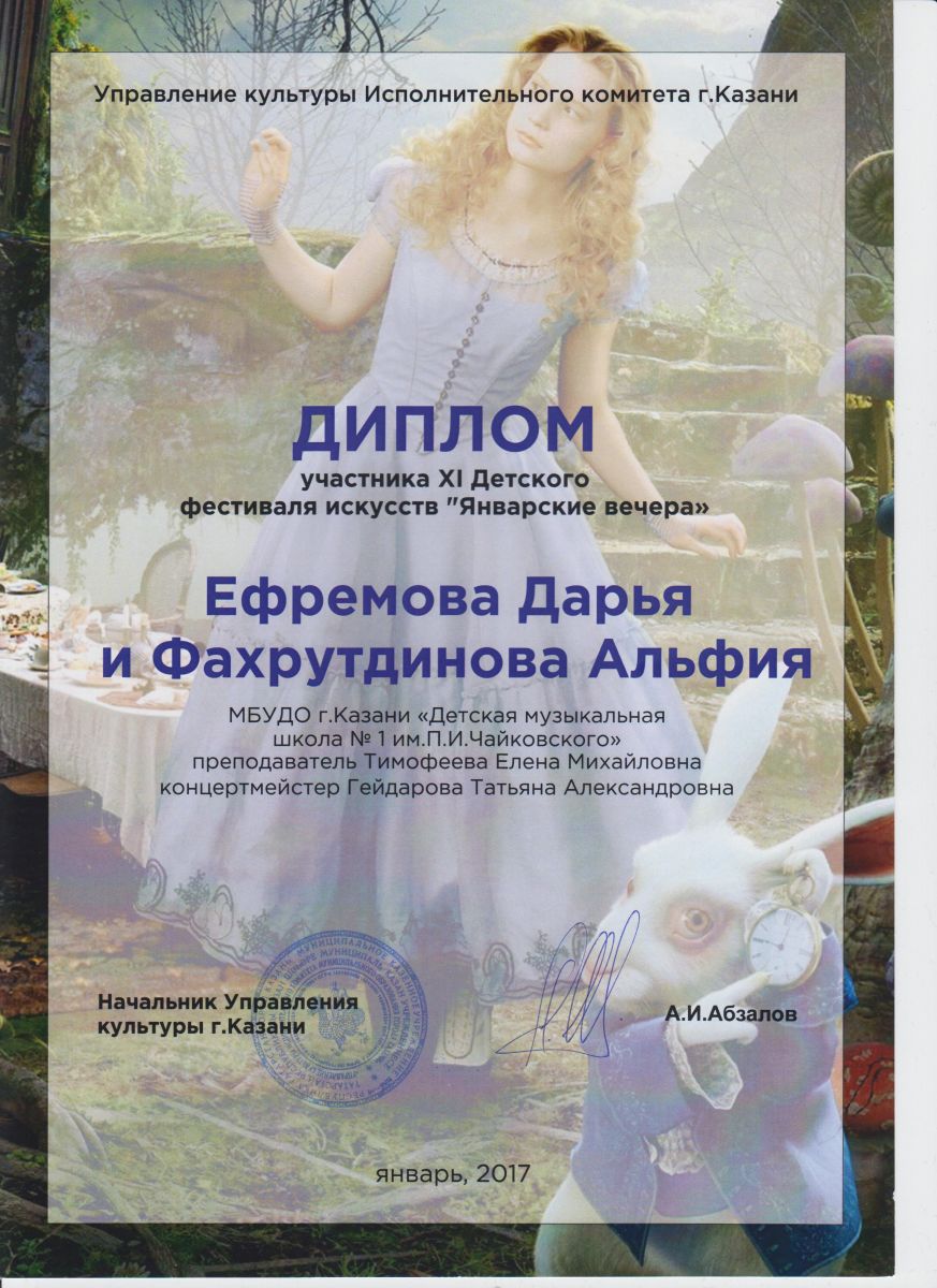 XI Детский фестиваль искусств "Январские вечера" - Ефремова Дарья, Фахрутдинова Алия, Диплом;