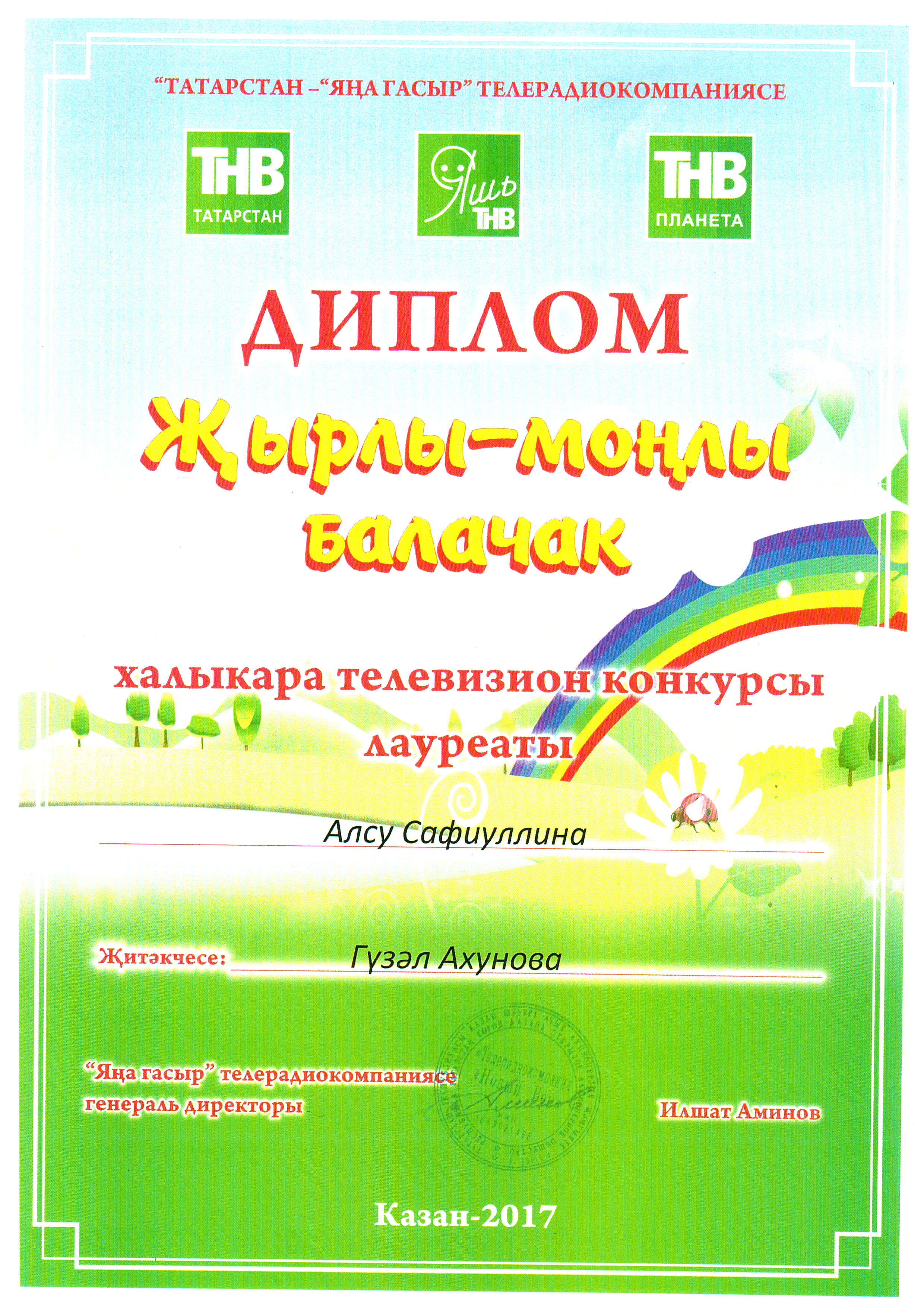 Республиканский телевизионный конкурс "Җырлы - моңлы балачак" - Сафиуллина Алсу, Лауреат;