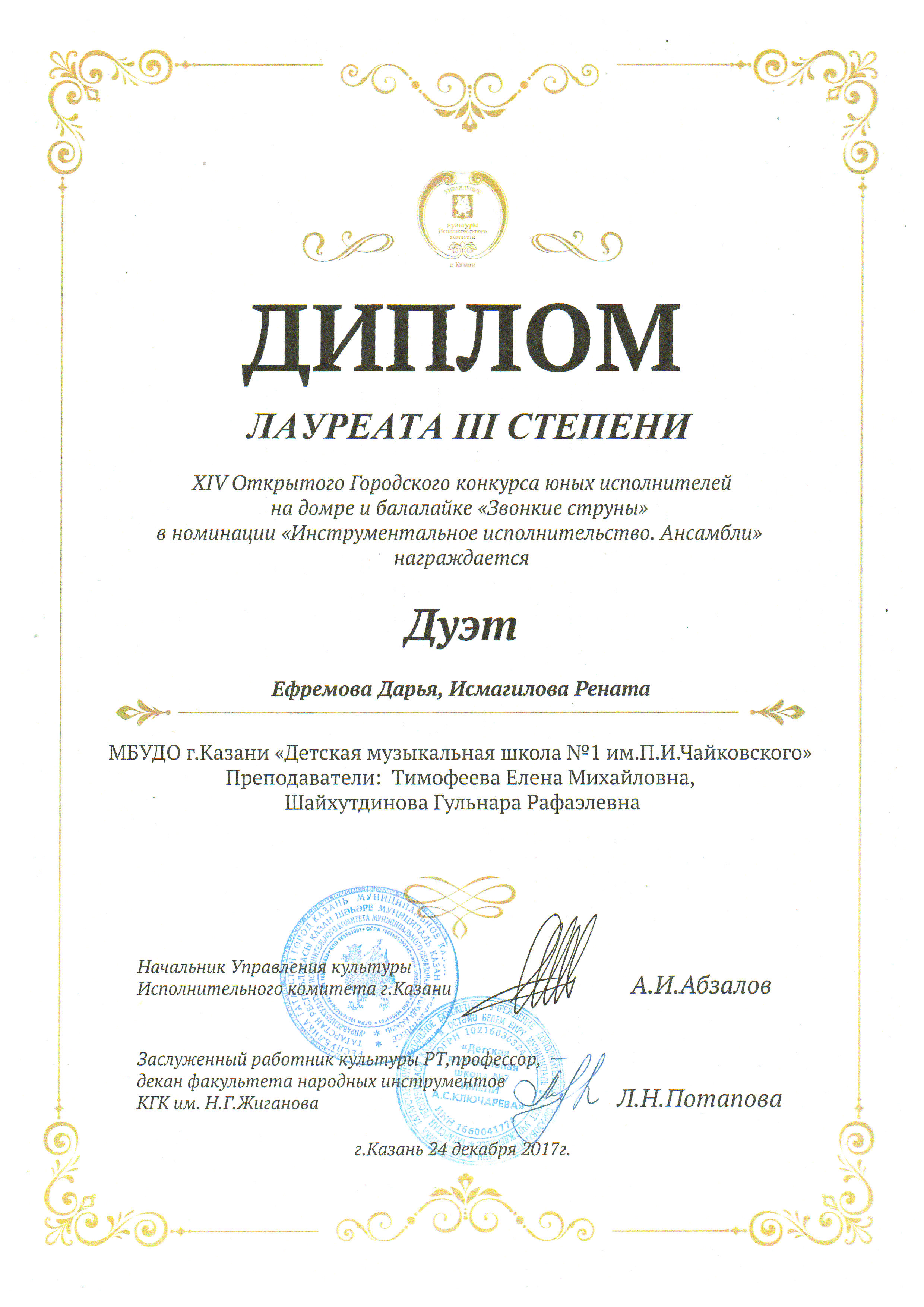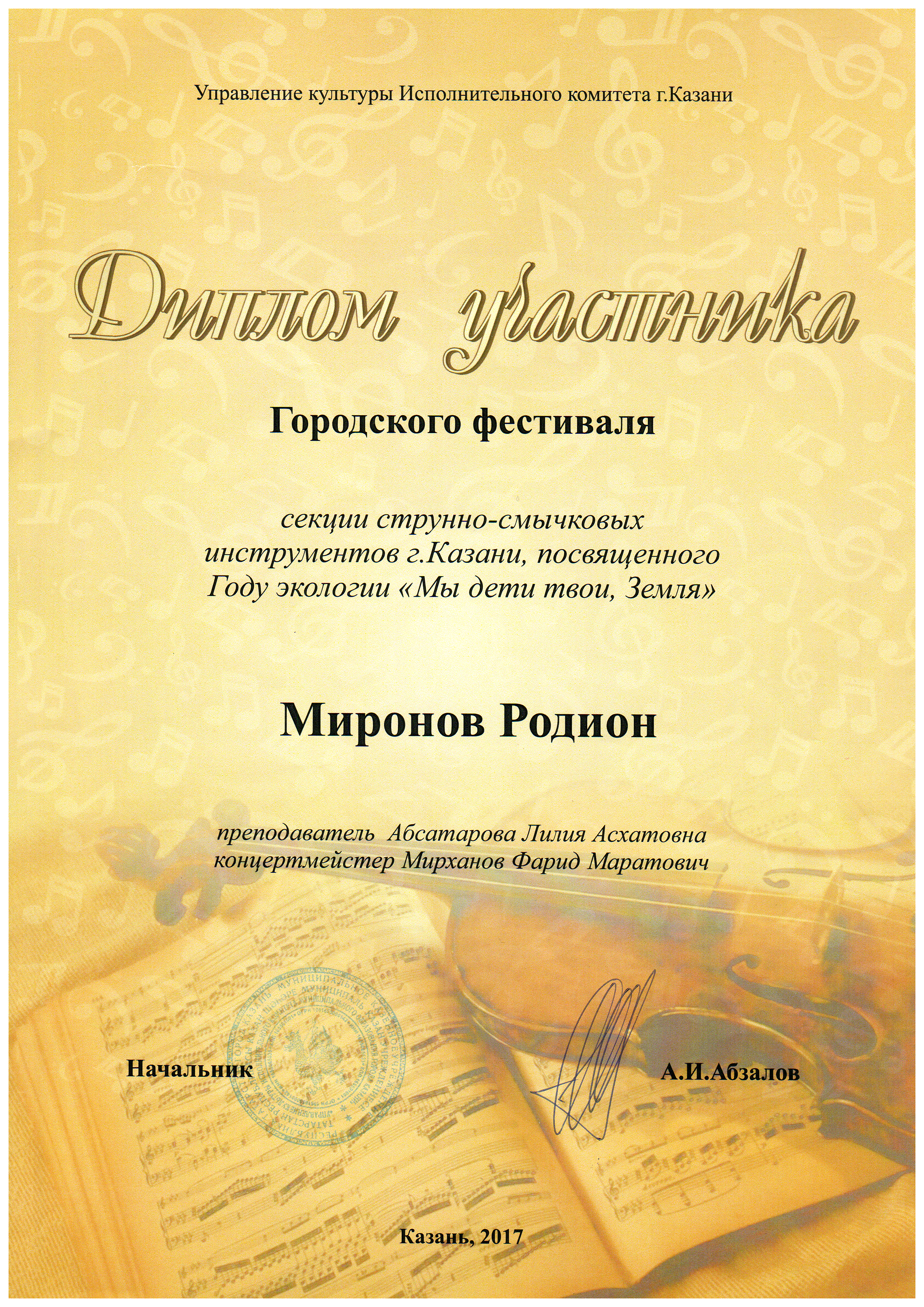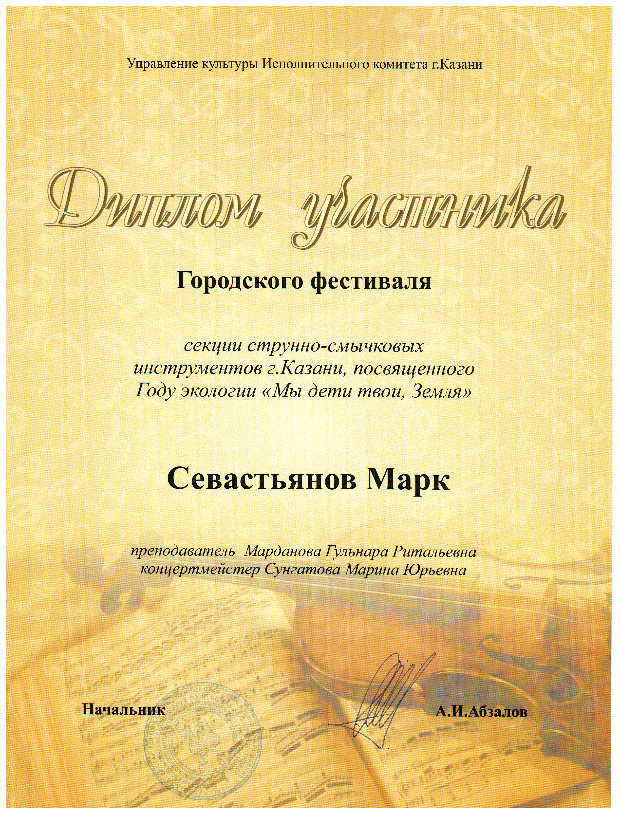 Городской фестиваль секции струнно-смычковых инструментов г.Казани "Мы дети твои, Земля", посвящённый Году экологии - Исмагилова Рената и Биюшев Пётр, Диплом участника;