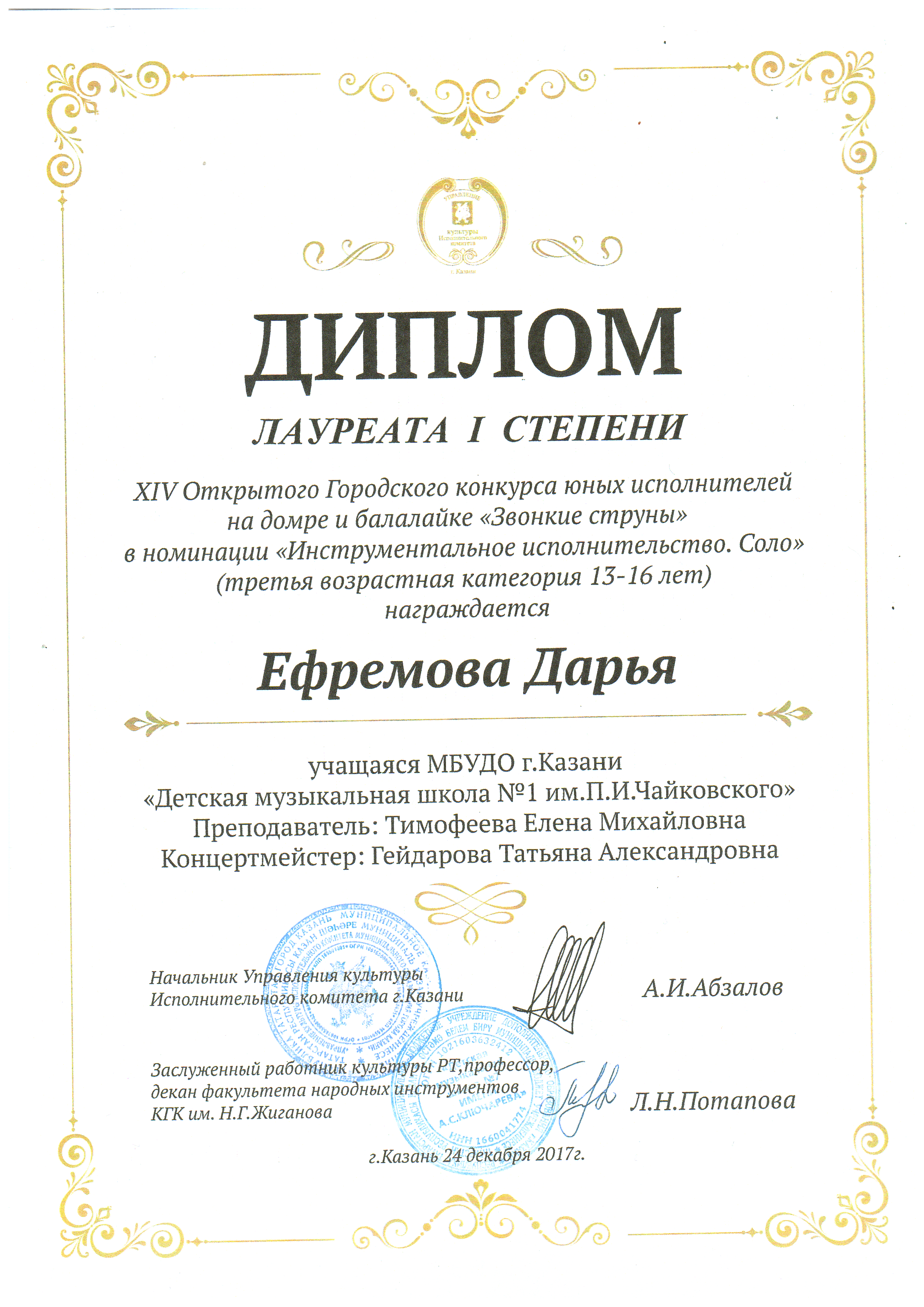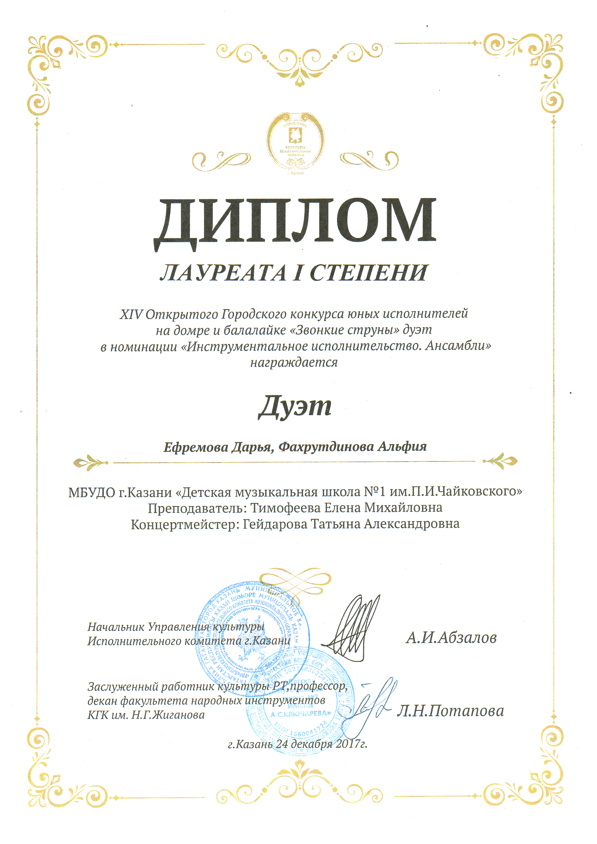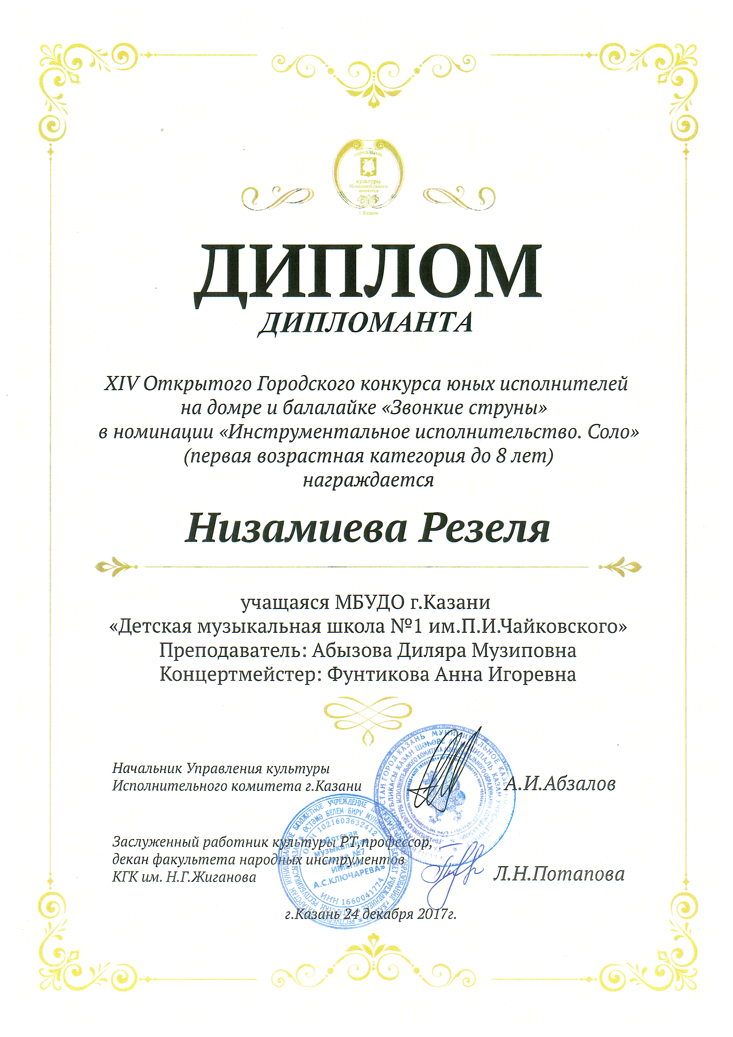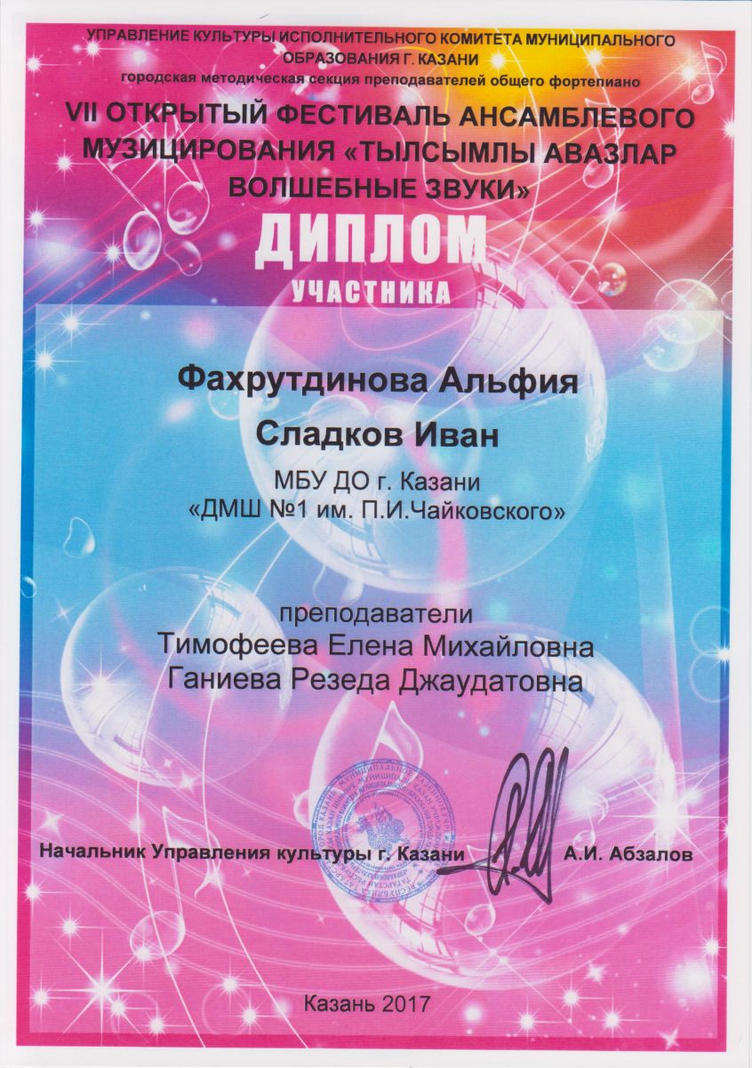 Городской фестиваль секции струнно-смычковых инструментов г.Казани "Мы дети твои, Земля", посвящённый Году экологии - Исмагилова Рената и Биюшев Пётр, Диплом участника;
