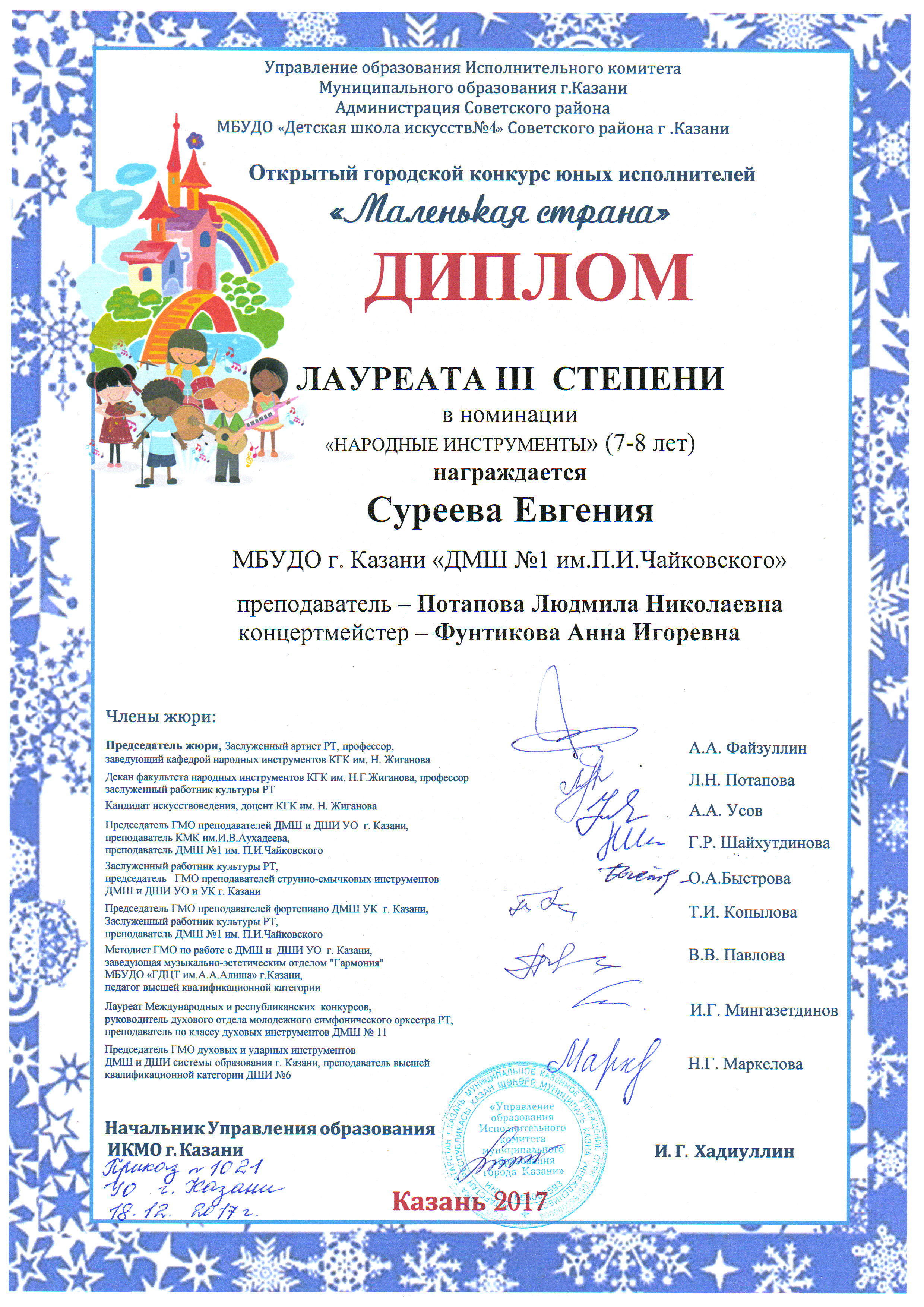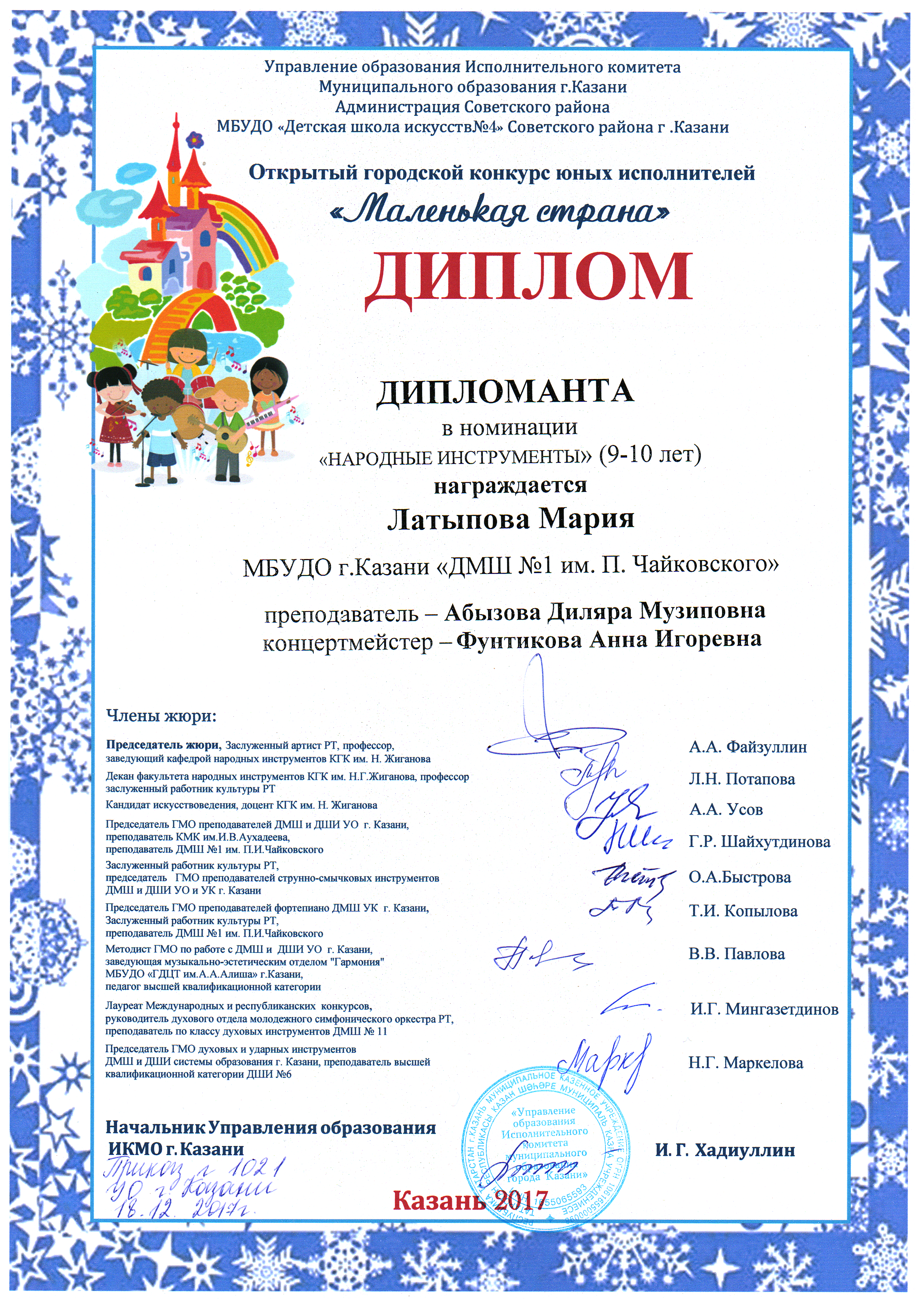 Открытый городской конкурс юных исполнителей "Маленькая страна" - Латыпова Мария, Дипломант;