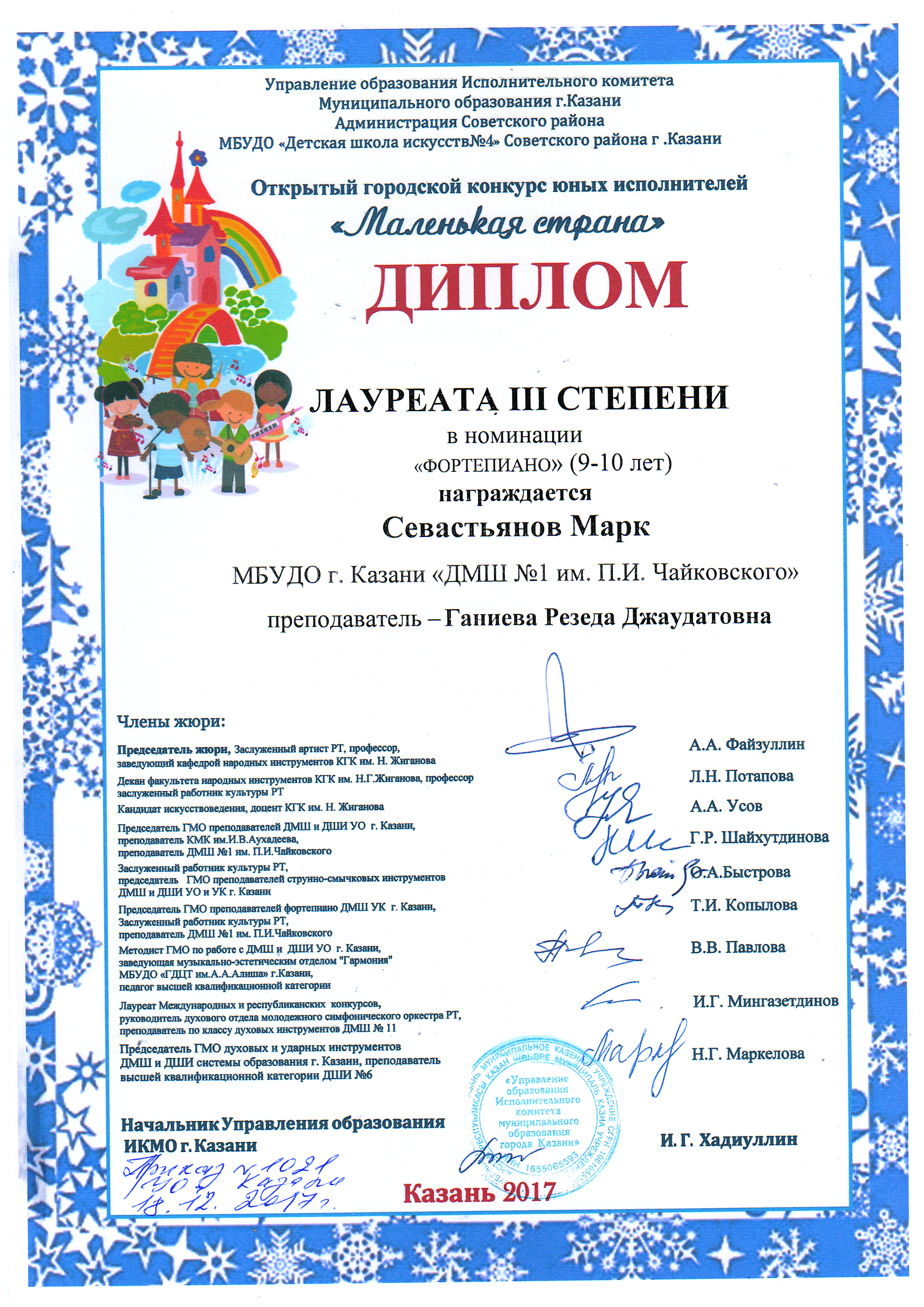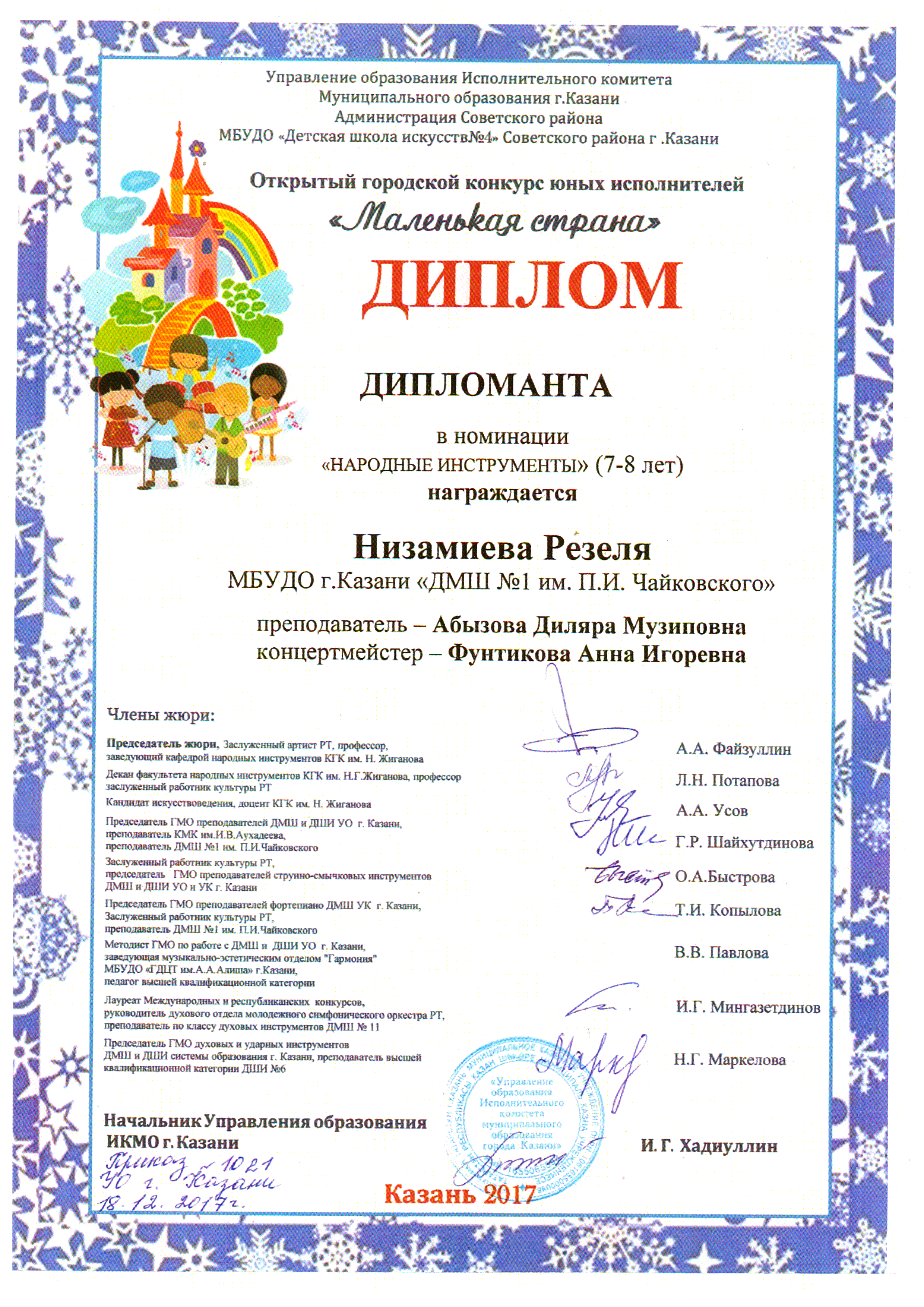 Открытый городской конкурс юных исполнителей "Маленькая страна" - Низамиева Резеля, Дипломант;