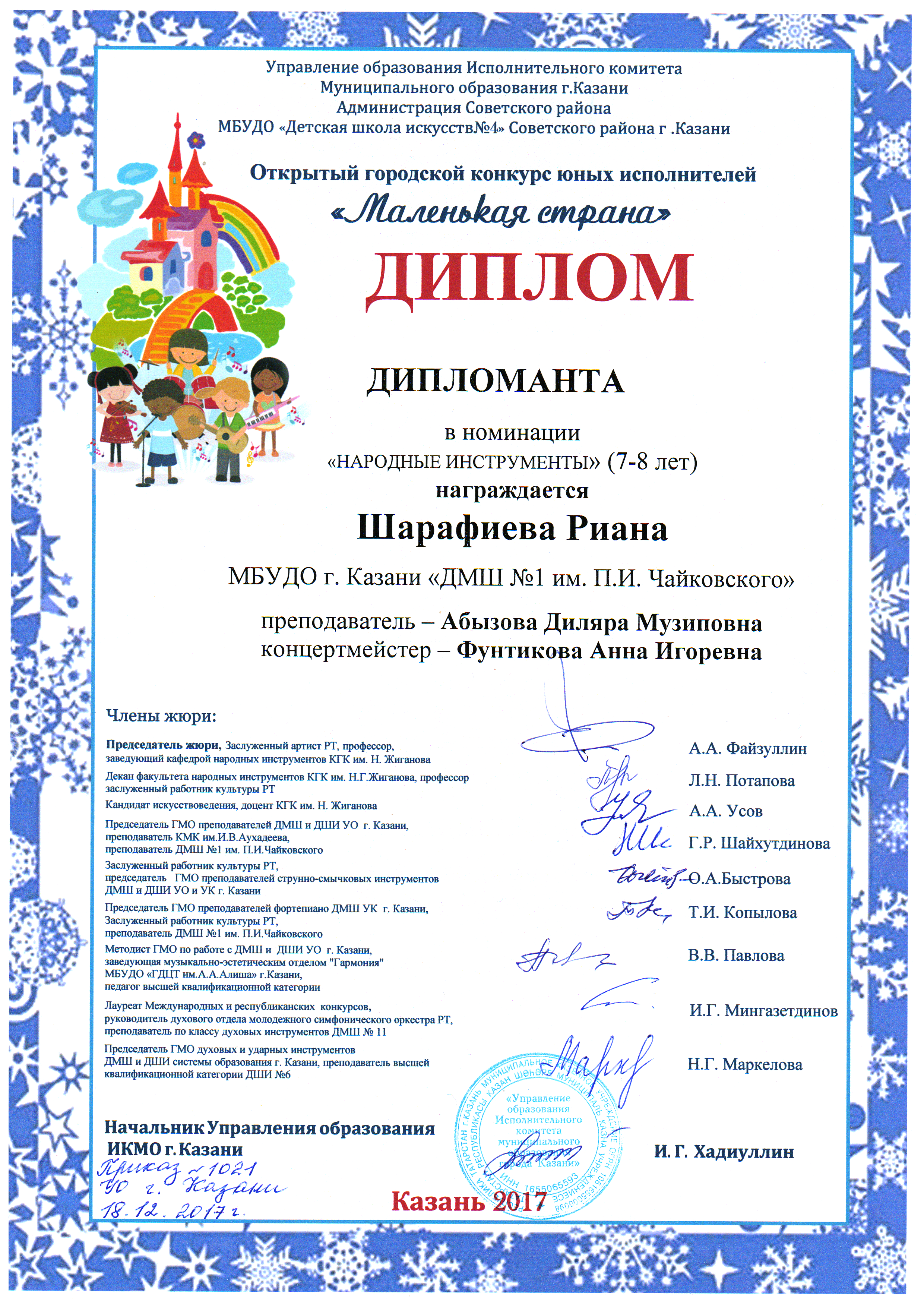 Открытый городской конкурс юных исполнителей "Маленькая страна" - Шарафиева Риана, Дипломант;