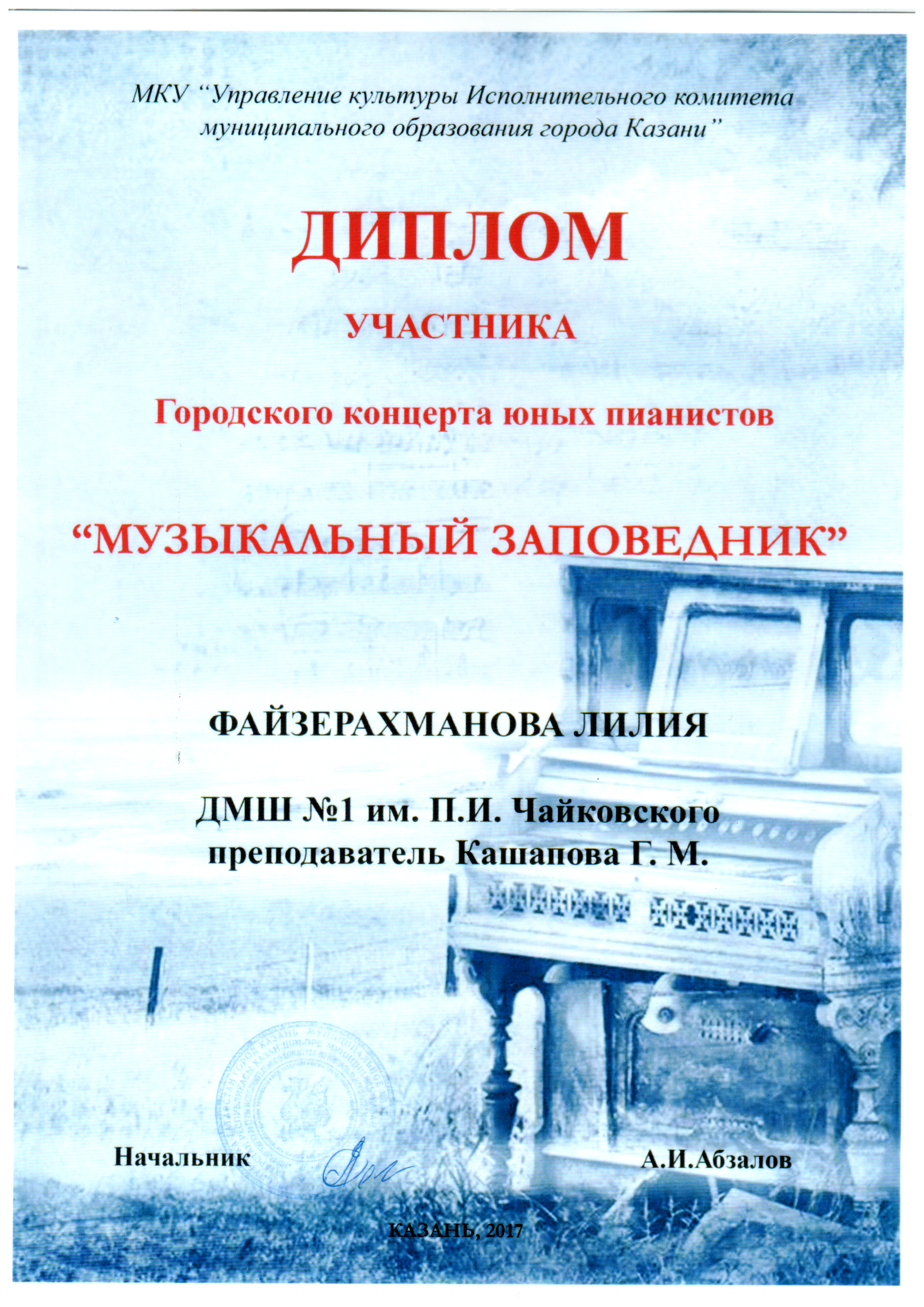 Городской концерт юных пианистов "Музыкальный заповедник" Файзерахманова Лилия, Диплом участника;