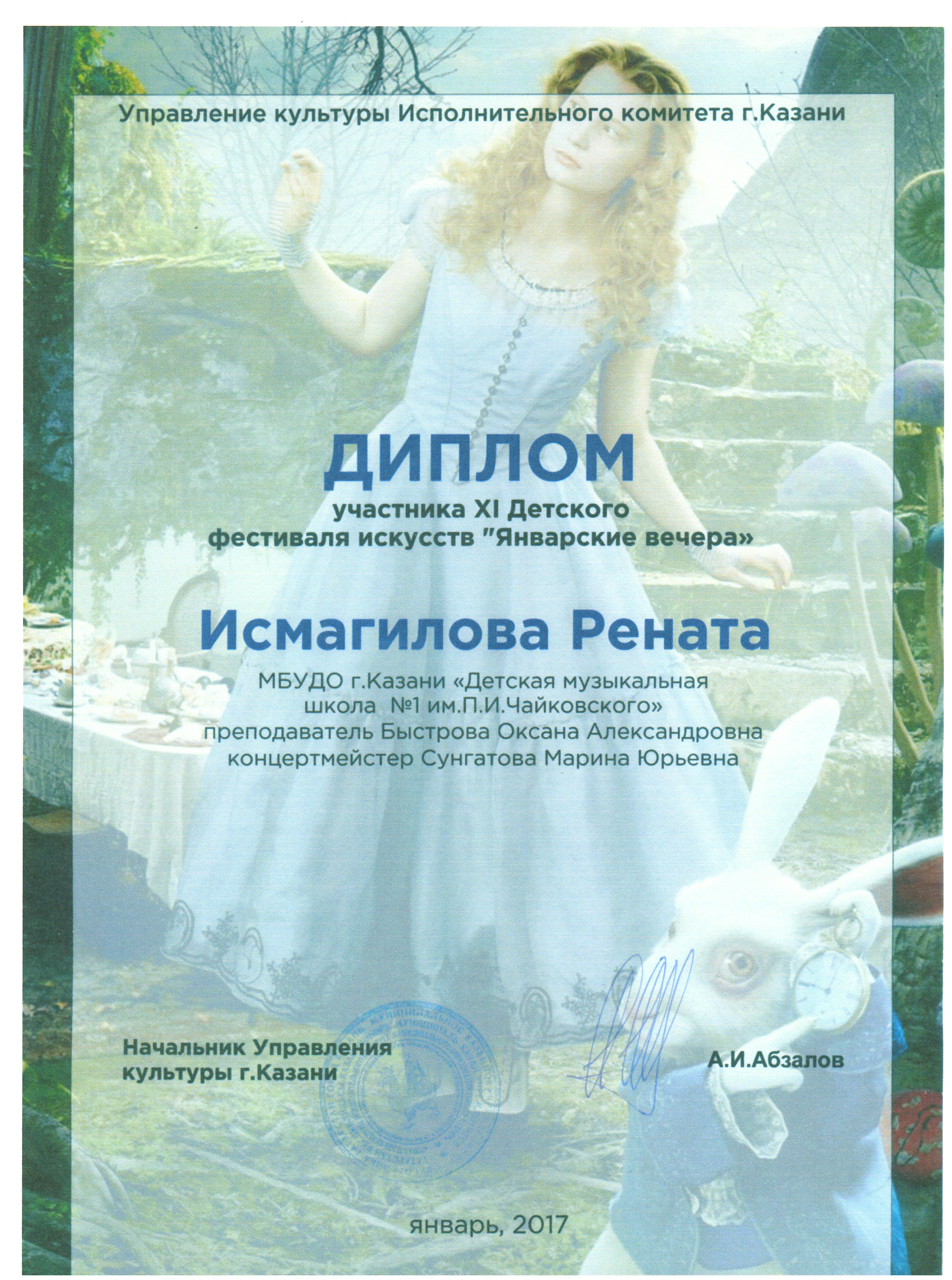 XI Детский фестиваль искусств "Январские вечера" - Исмагилова Рената, Диплом;