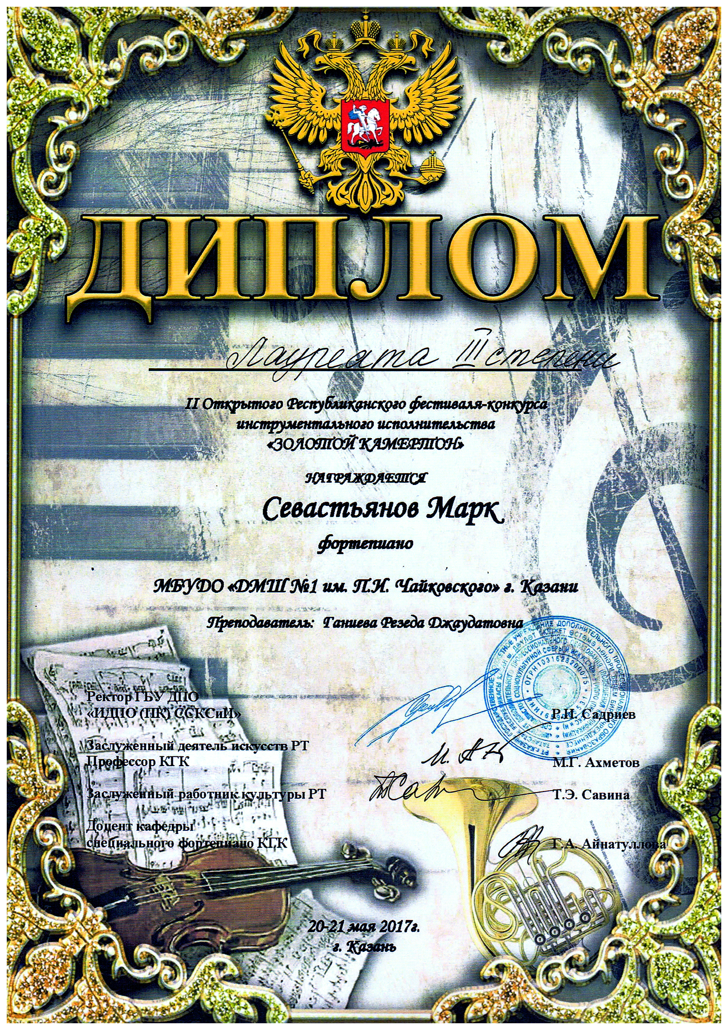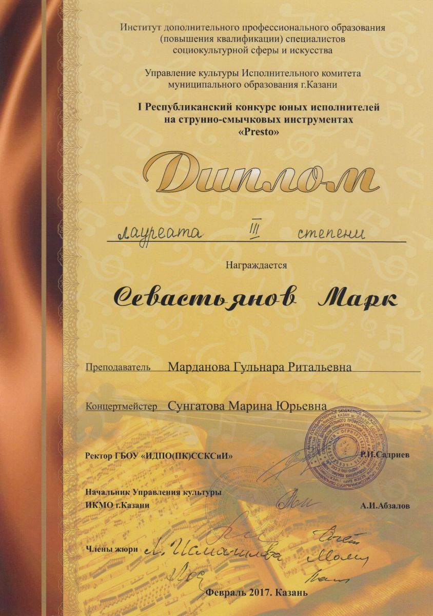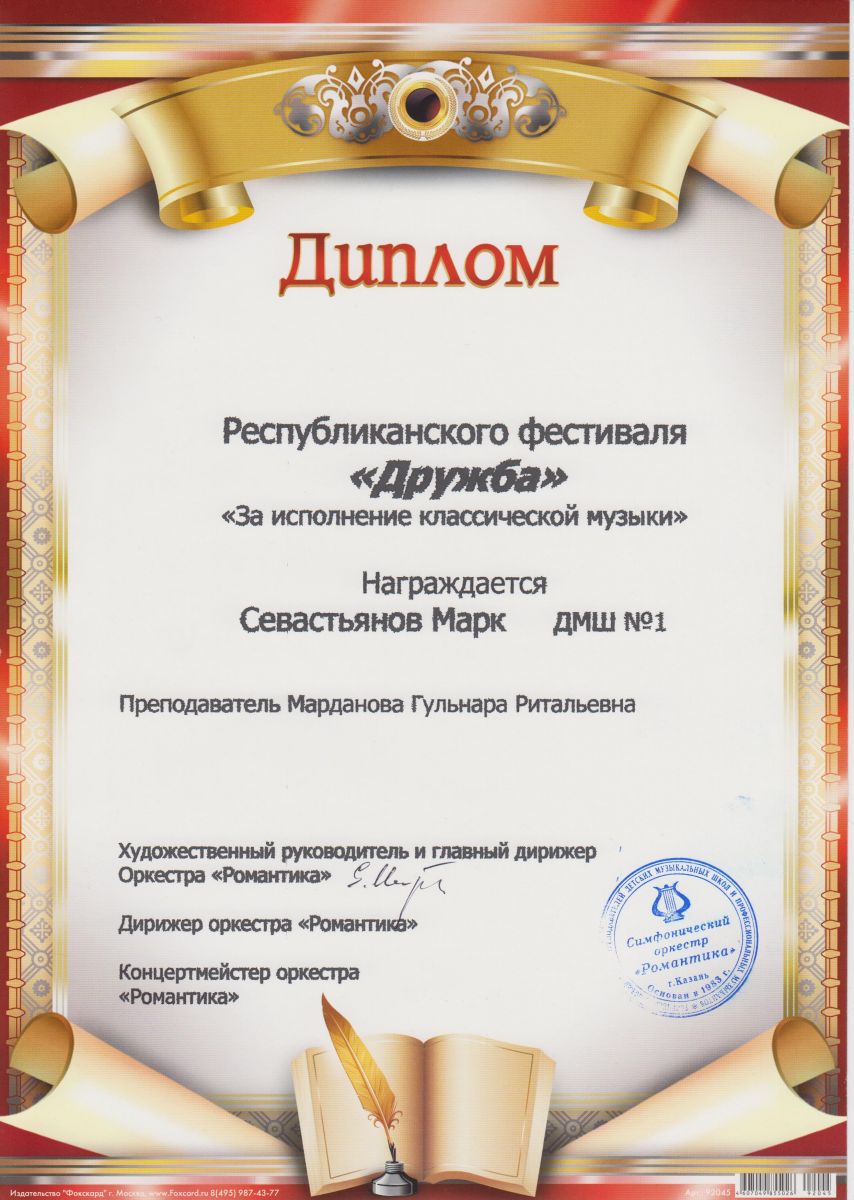 Республиканский фестиваль "Дружба" - Севастьянов Марк, Диплом за исполнение классической музыки;