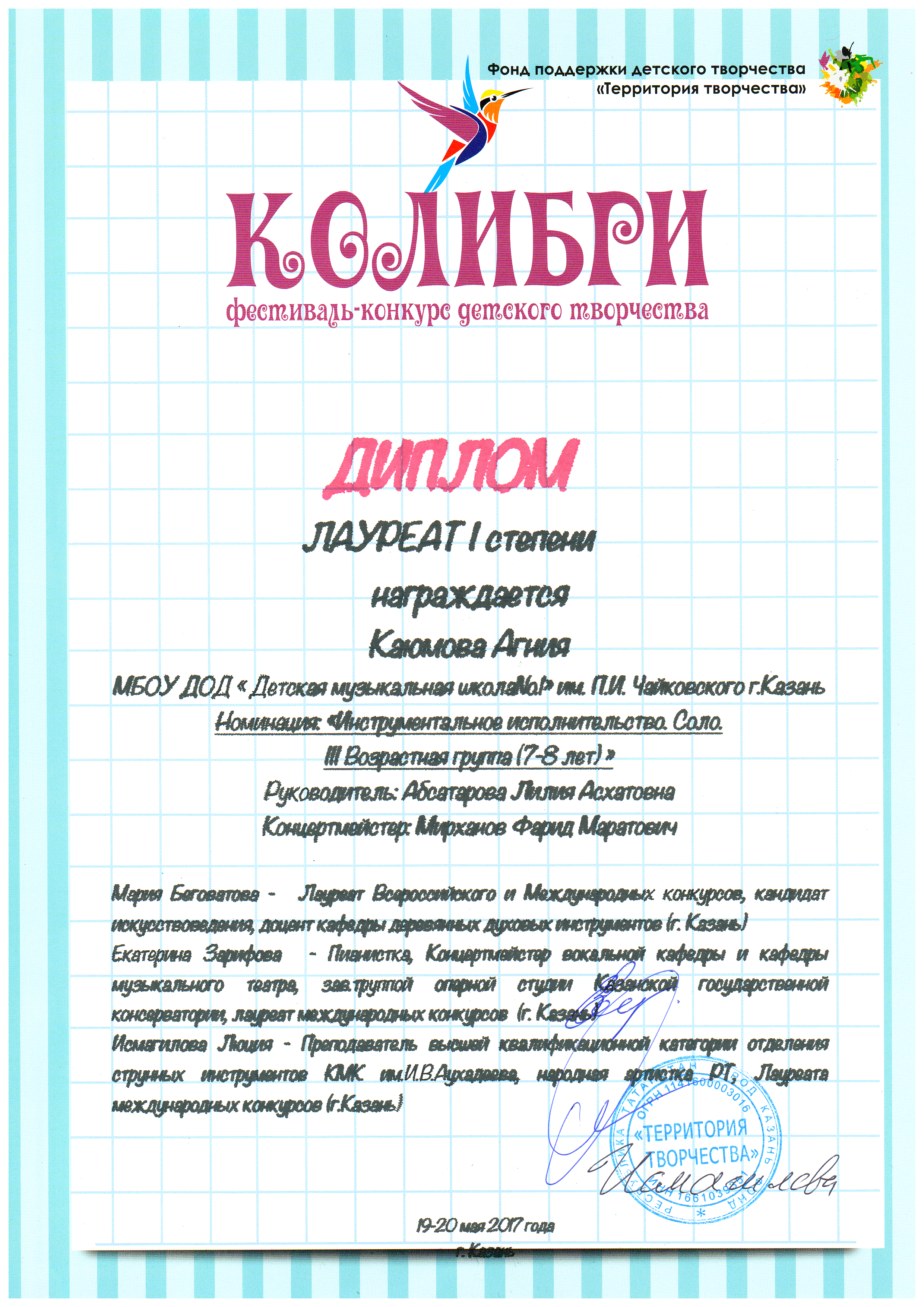 Республиканский фестиваль-конкурс детского творчества "Колибри" - Каюмова Агния, Лауреат I степени;