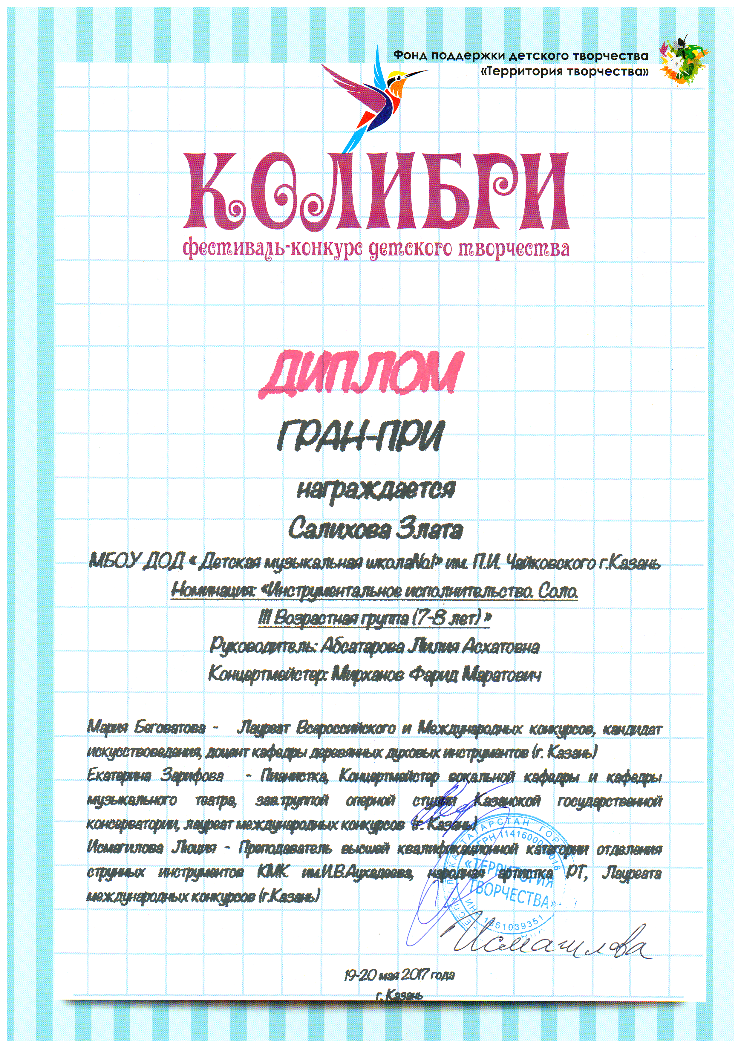 Республиканский фестиваль-конкурс детского творчества "Колибри" - Салихова Злата, Гран-При;