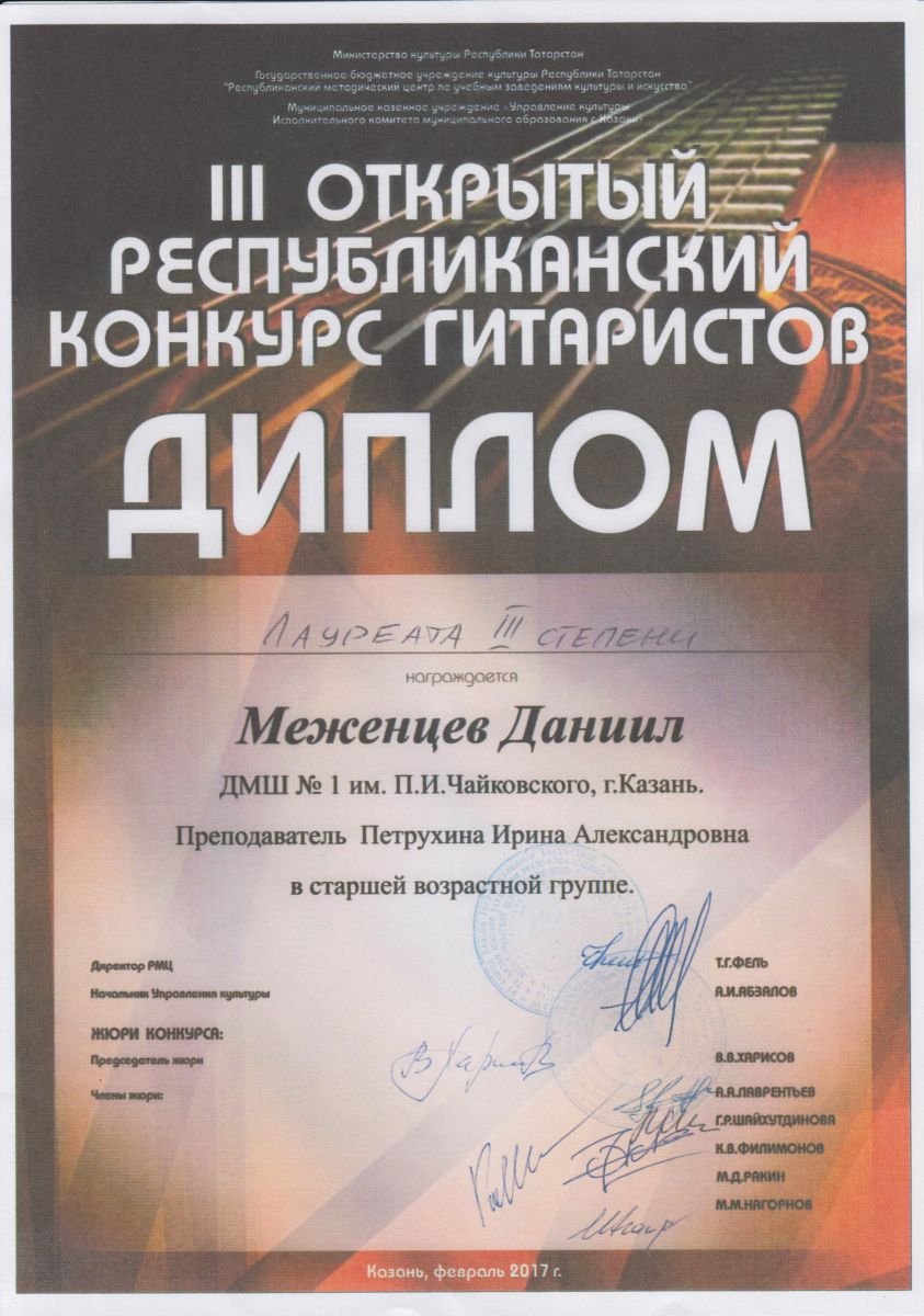 III Открытый Республиканский конкурс гитаристов - Меженцев Даниил, Лауреат III степени;