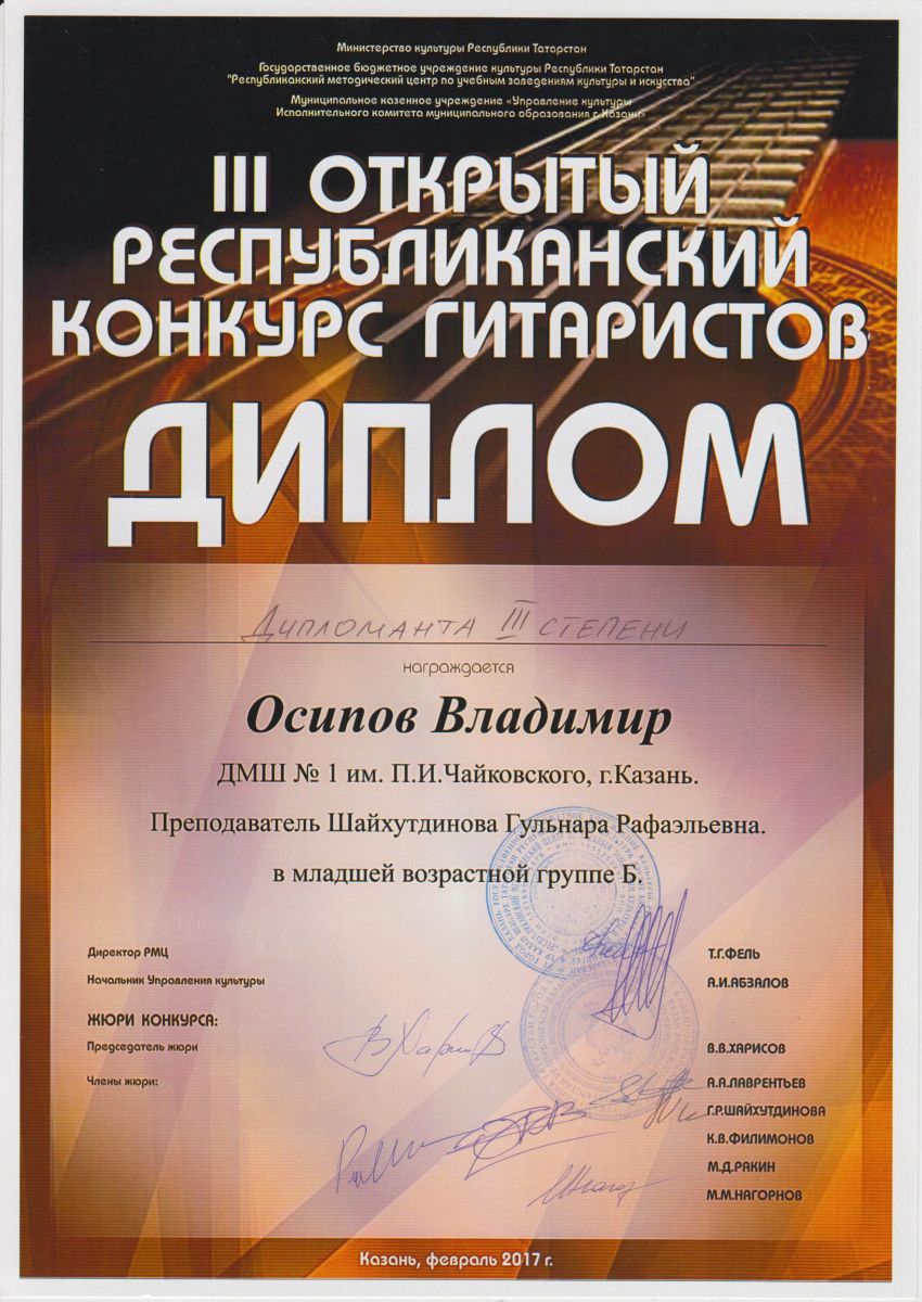 III Открытый Республиканский конкурс гитаристов - Осипов Владимир, Дипломант III степени;