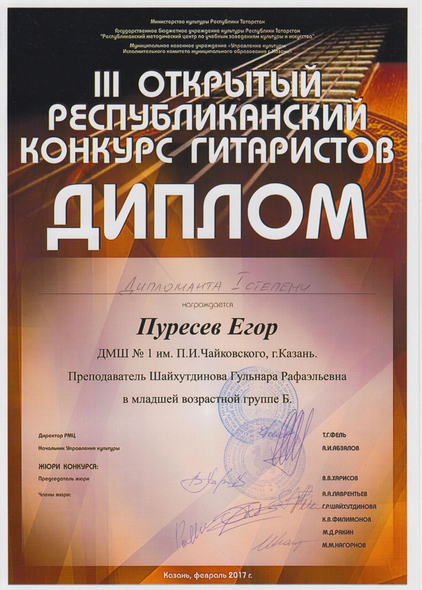 III Открытый Республиканский конкурс гитаристов - Пуресев Егор, Дипломант I степени;