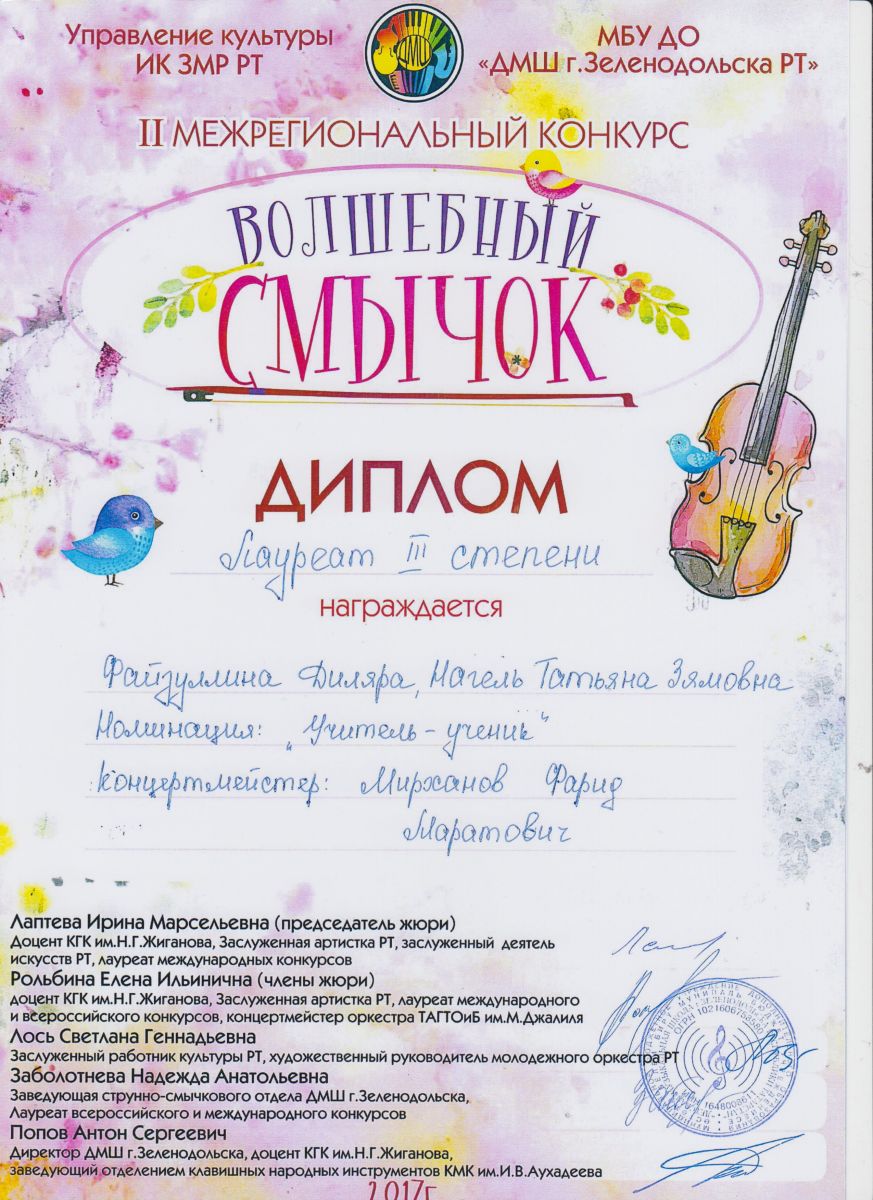 II Межрегиональный конкурс "Волшебный смычок" - Файзуллина Диляра, Нагель Т.З., Лауреат II степени;