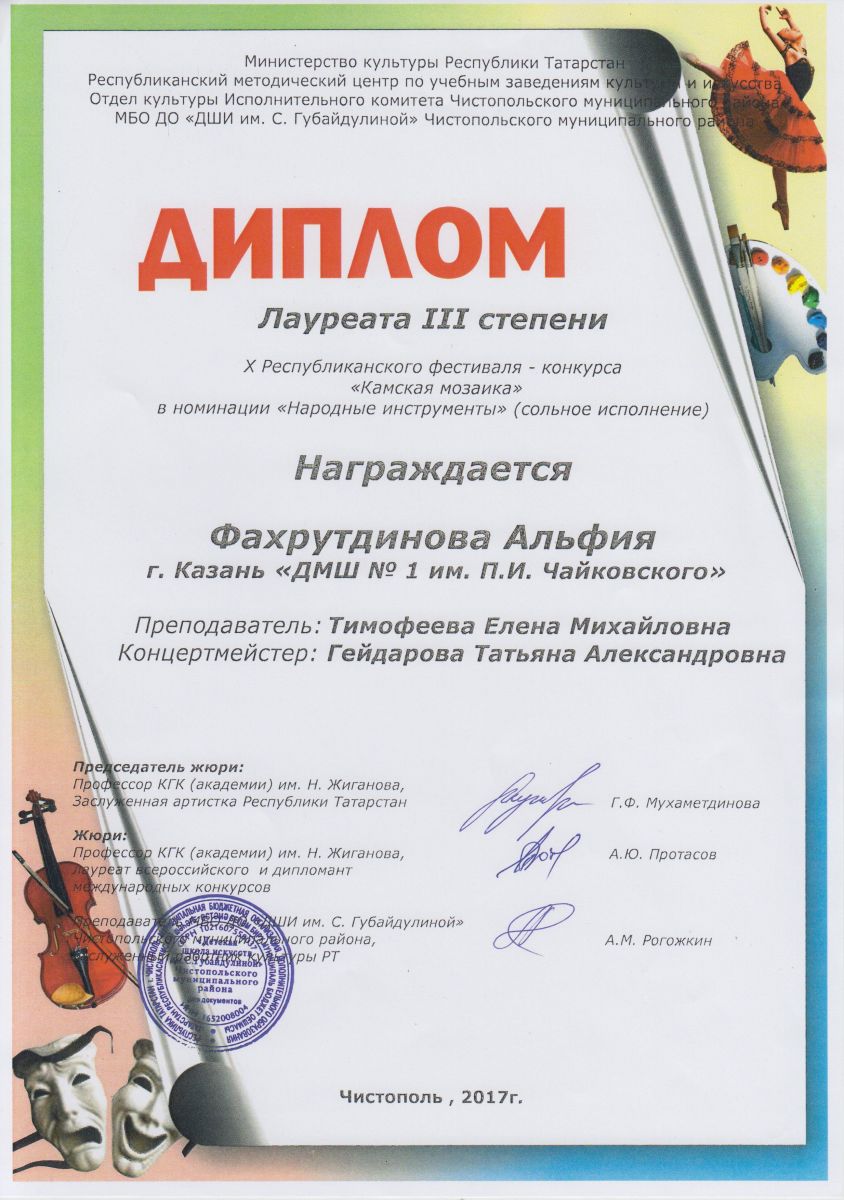Х Республиканский фестиваль-конкурс "Камская мозаика" - Фахрутдинова Альфия, Лауреат III степени;