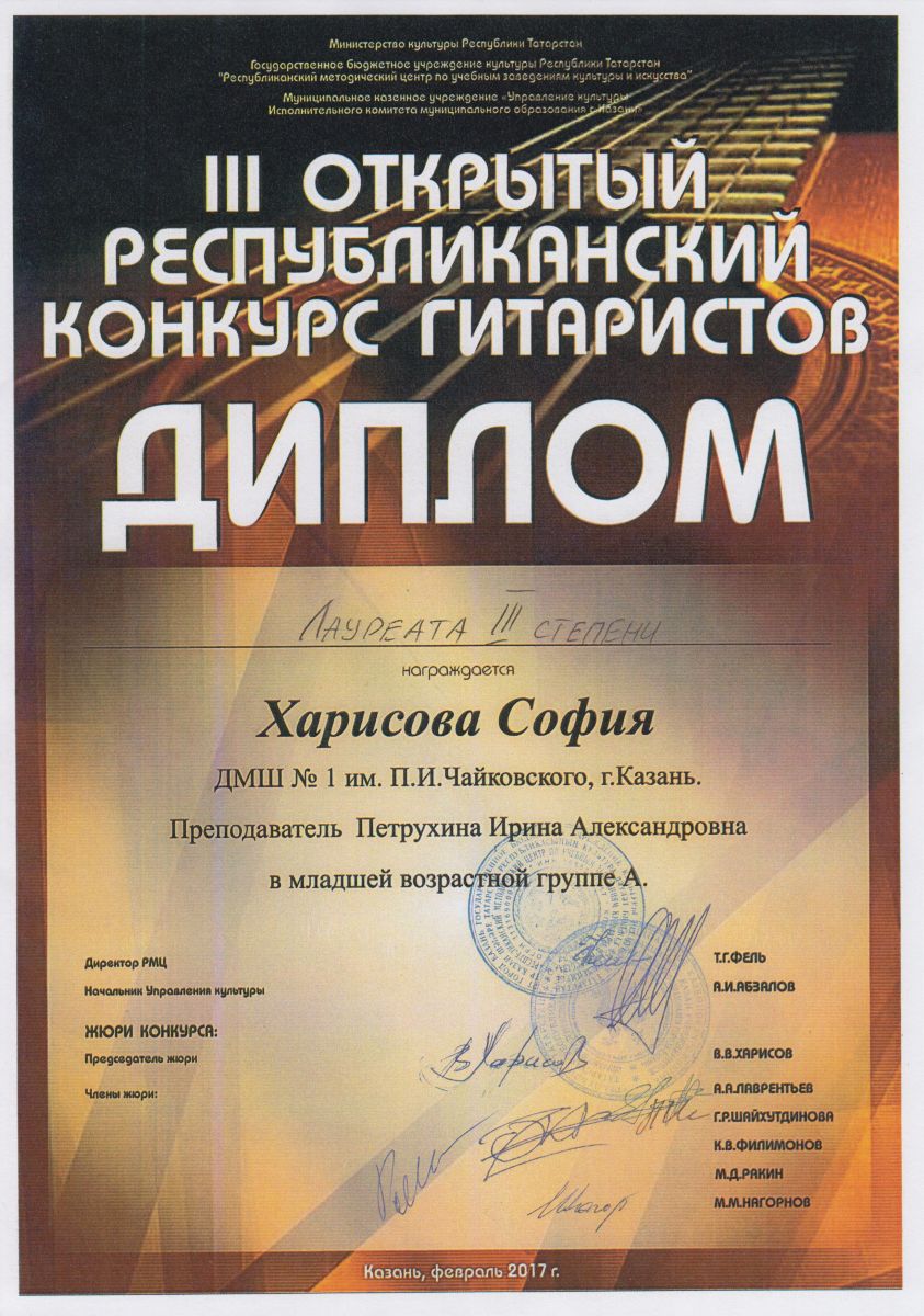 III Открытый Республиканский конкурс гитаристов - Харисова София, Лауреат III степени;