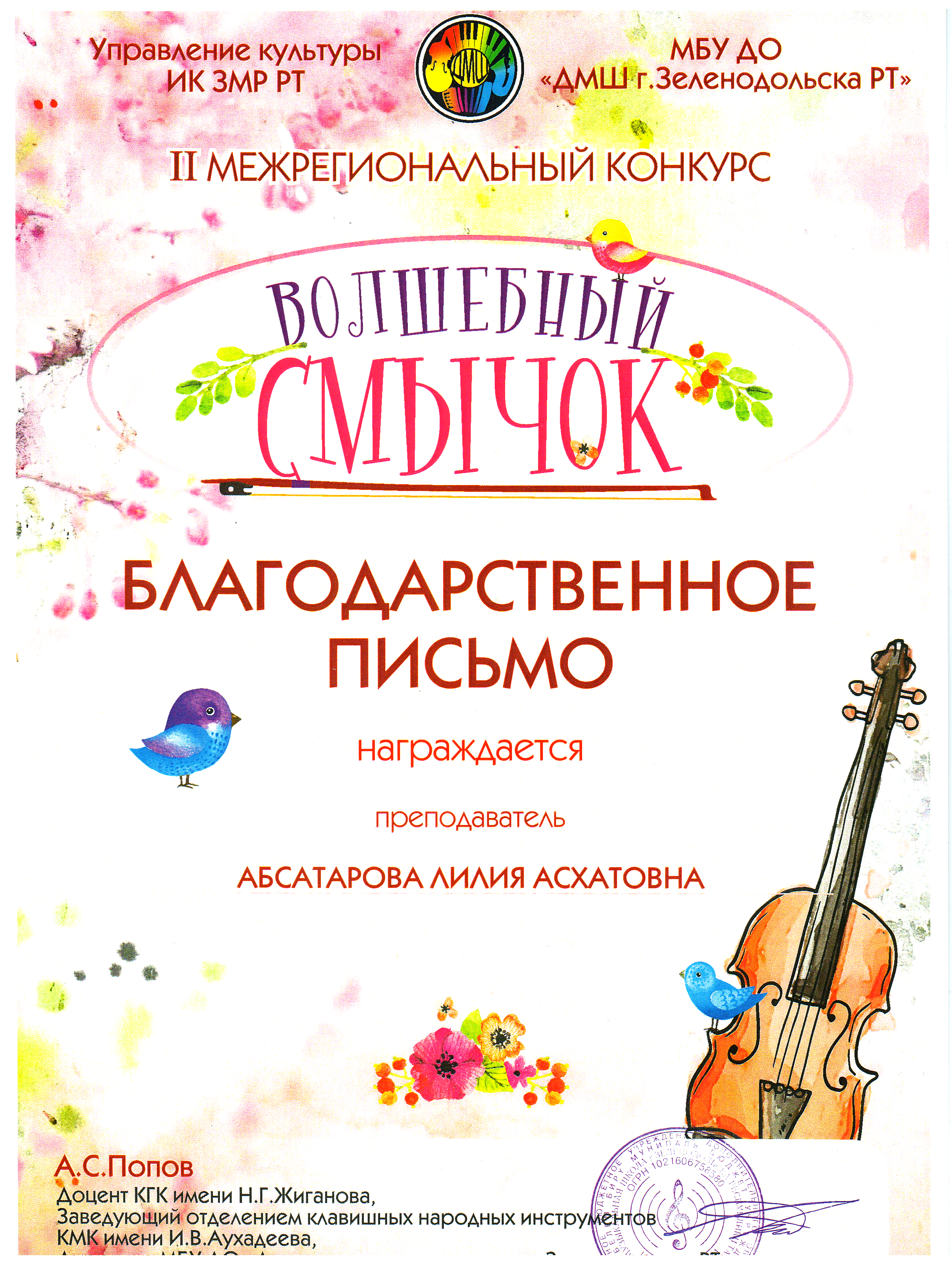 II Межрегиональный конкурс "Волшебный смычок" - Абсатарова Л.А., Благодарственное письмо;