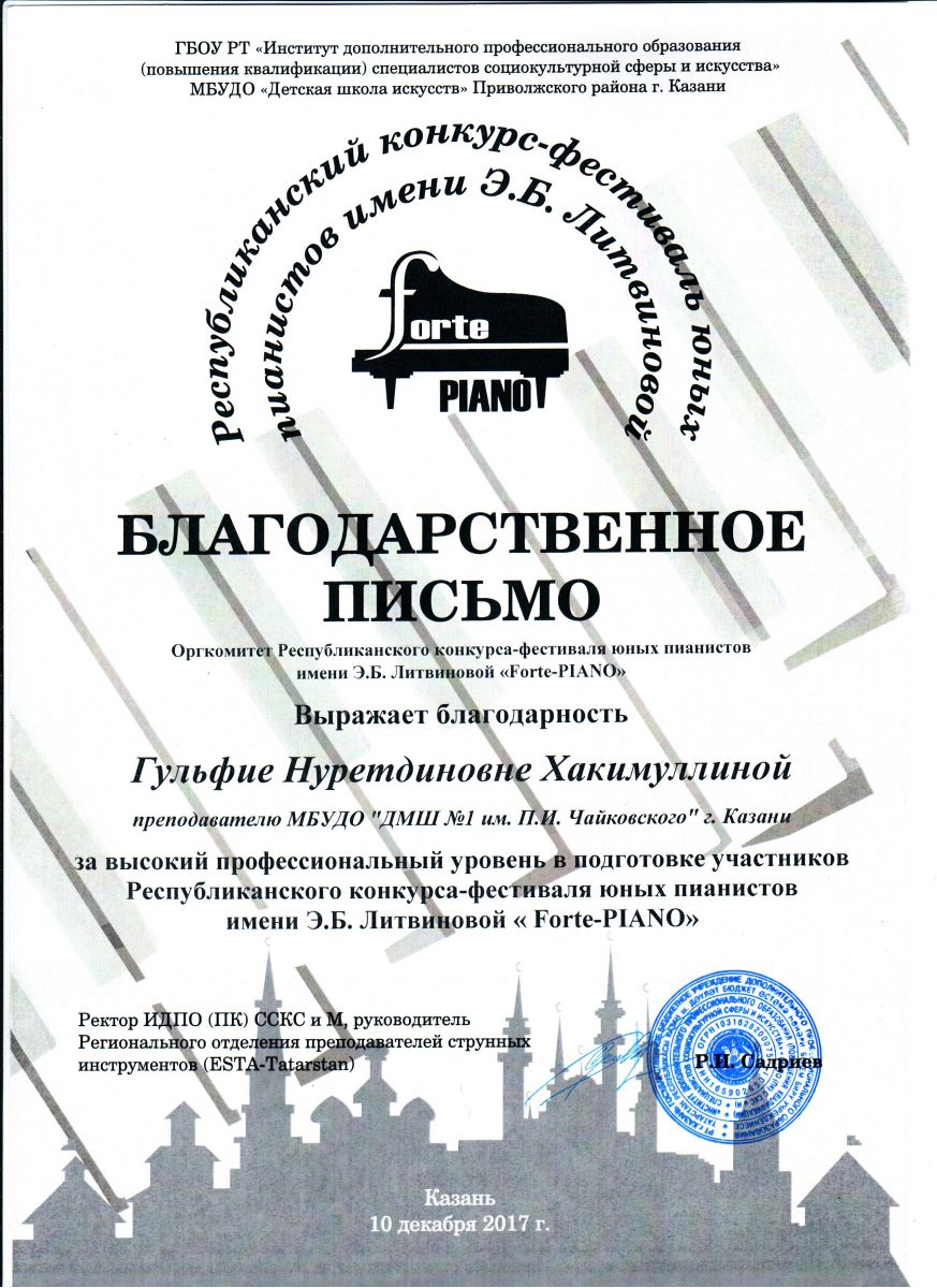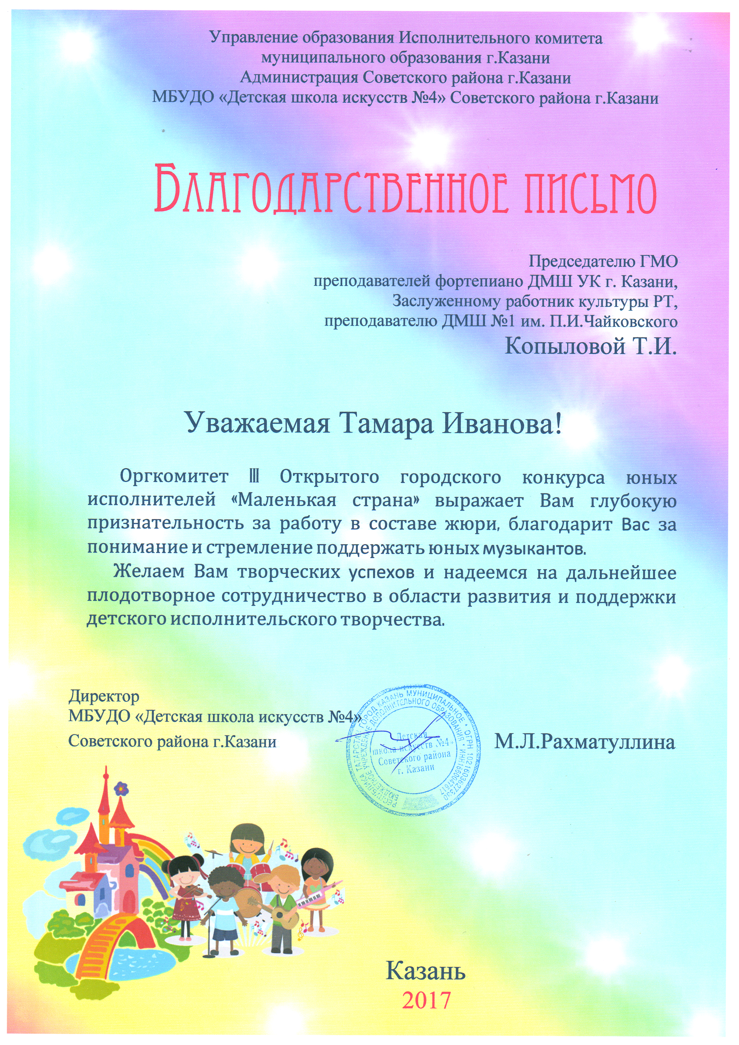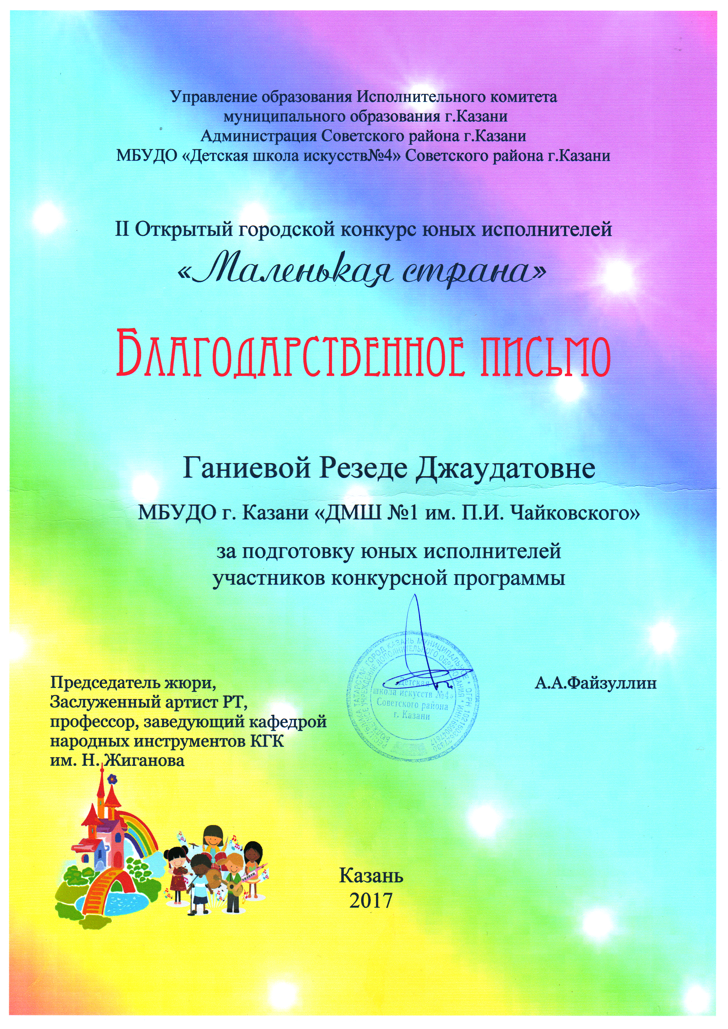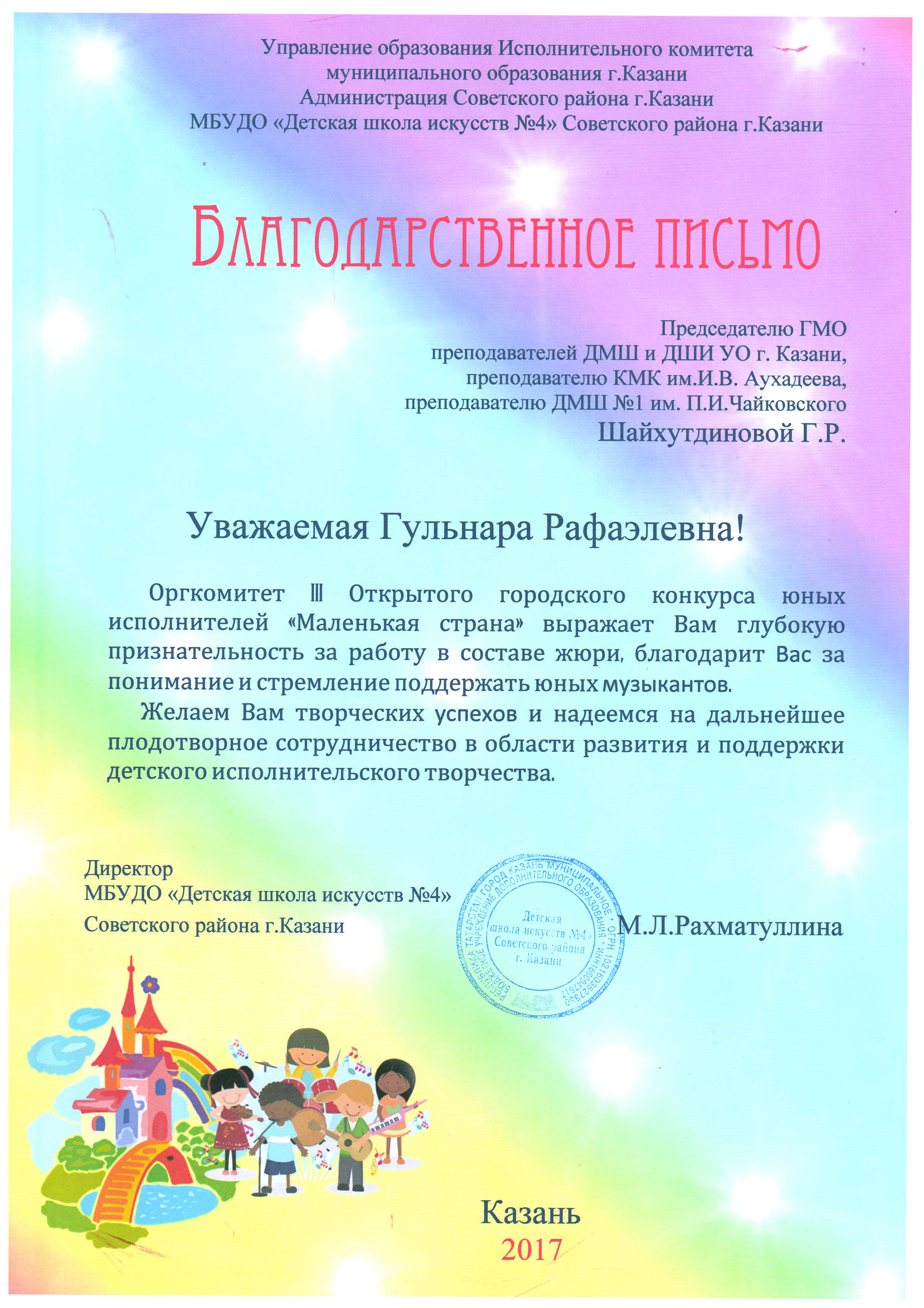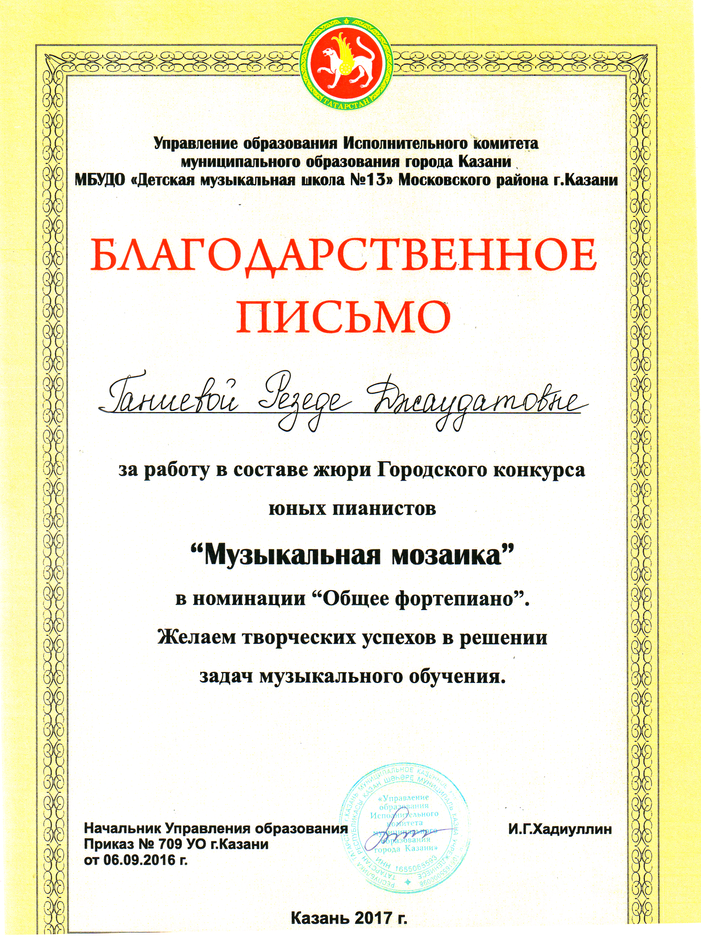 Городской конкурс юных пианистов "Музыкальная мозаика" - Ганиева Р.Д., Благодарственное письмо;