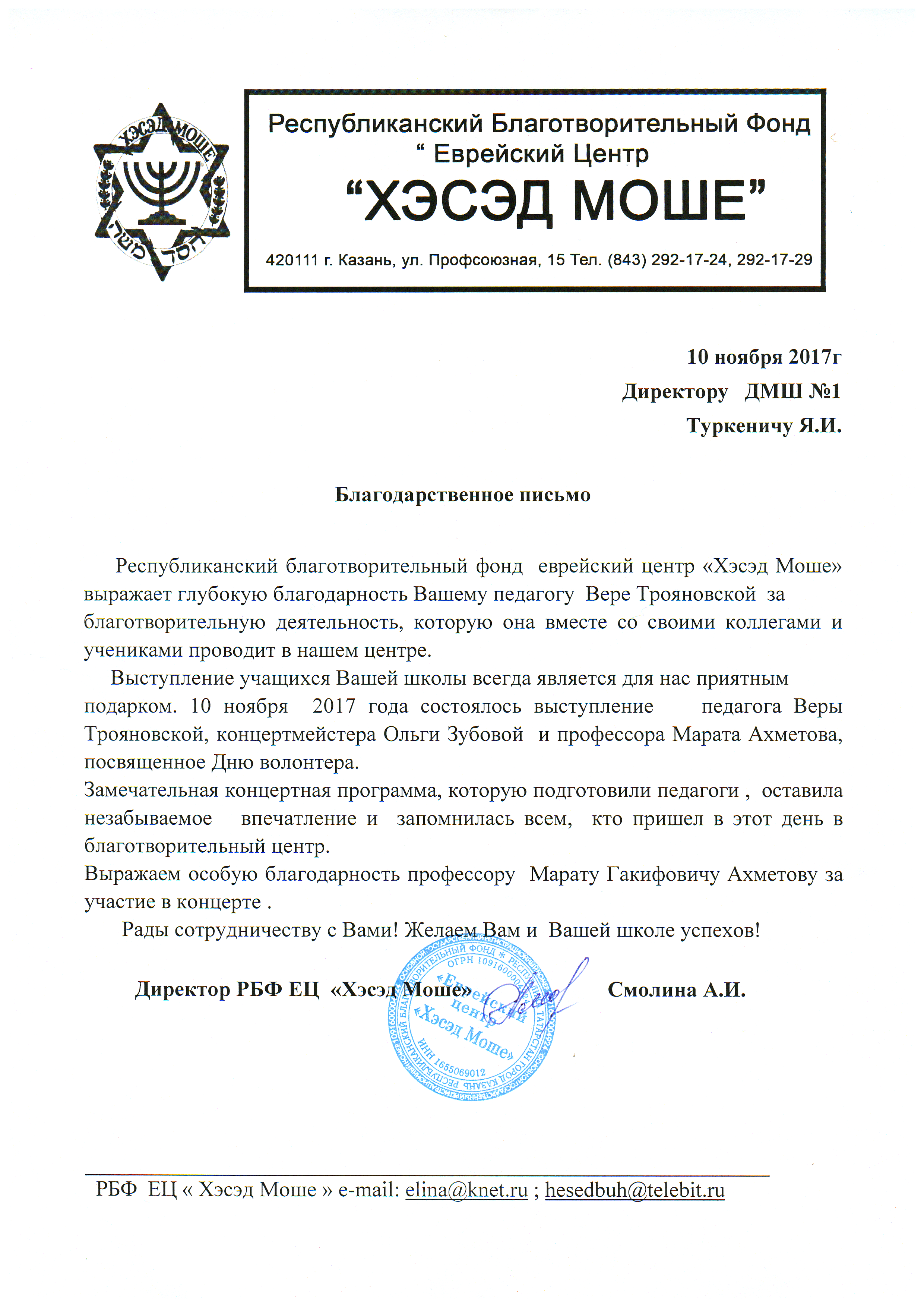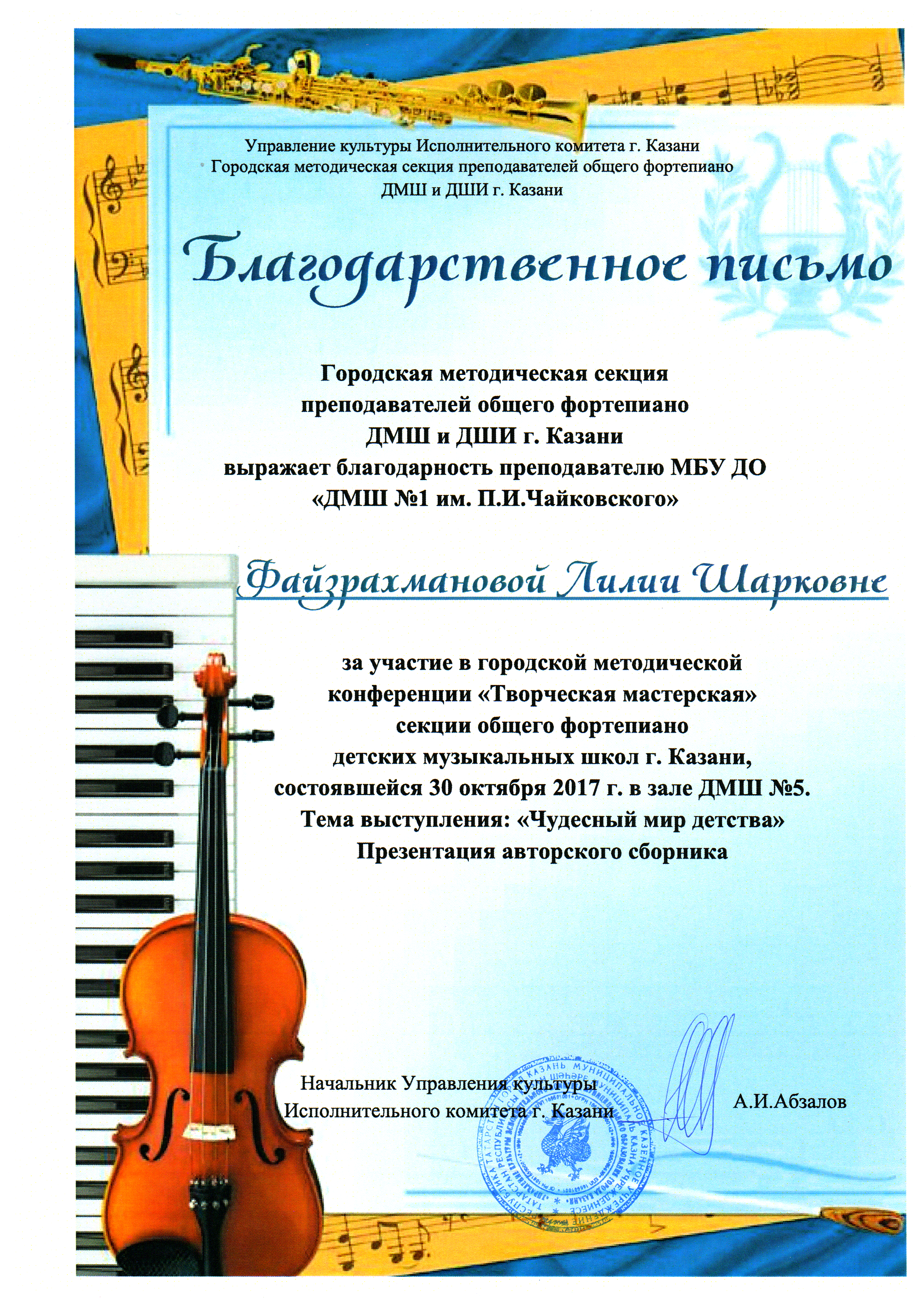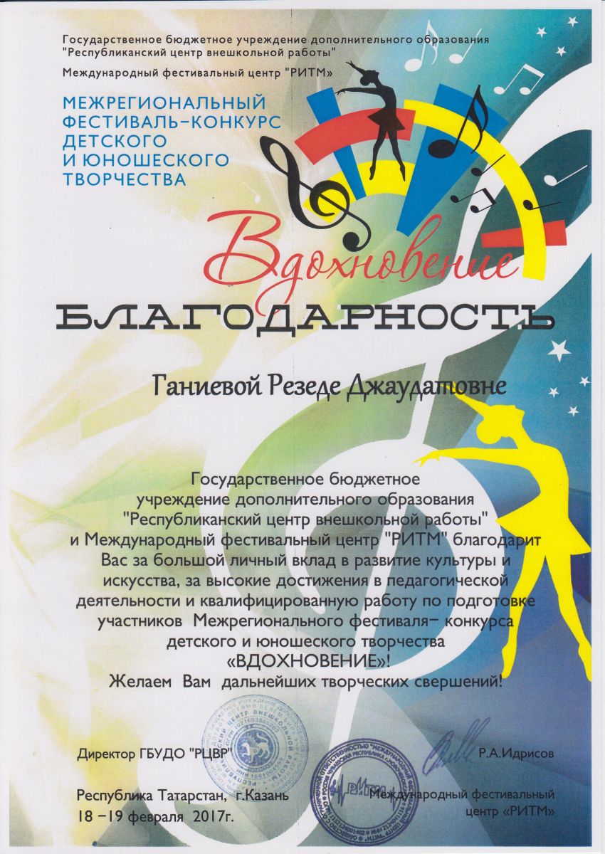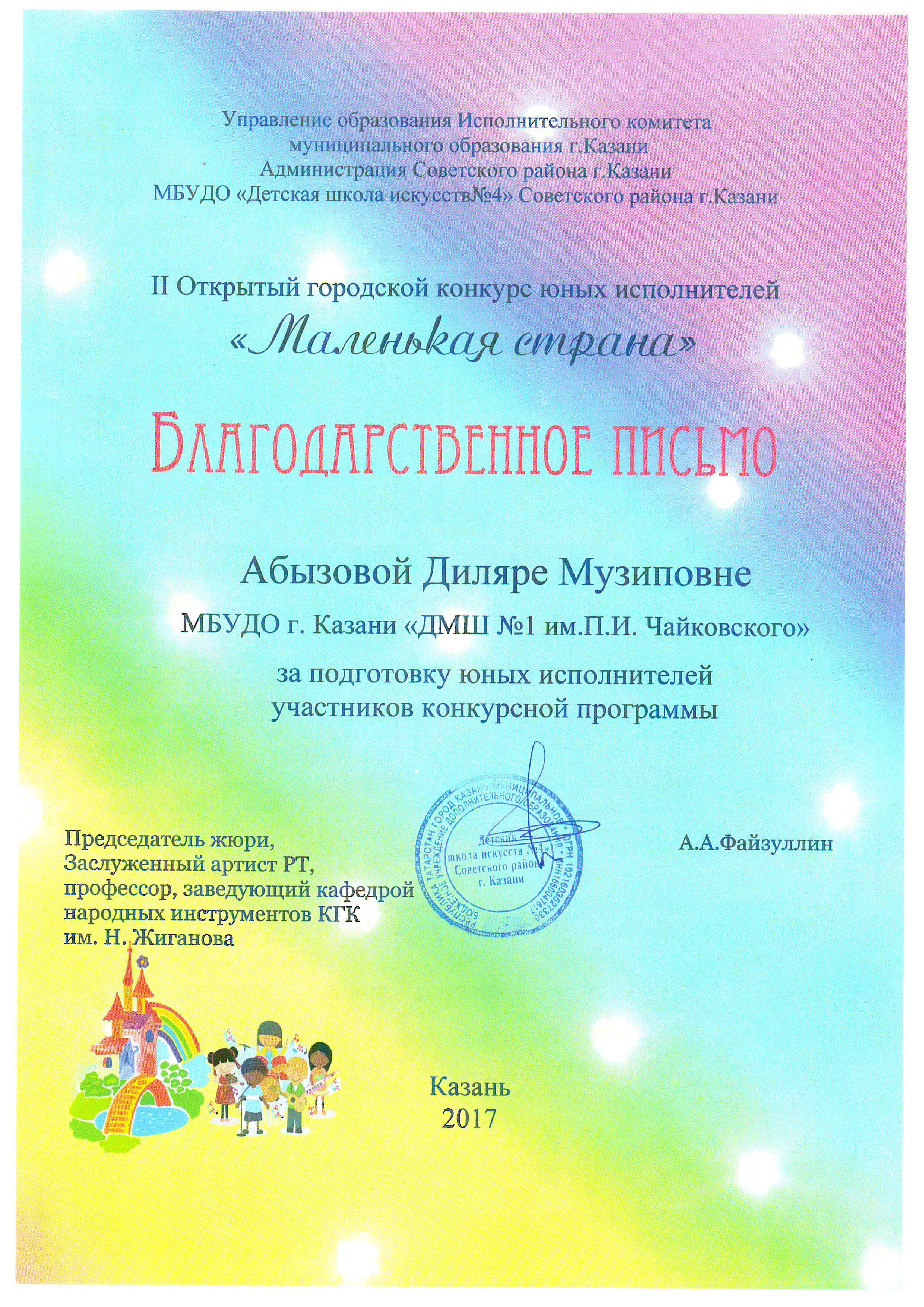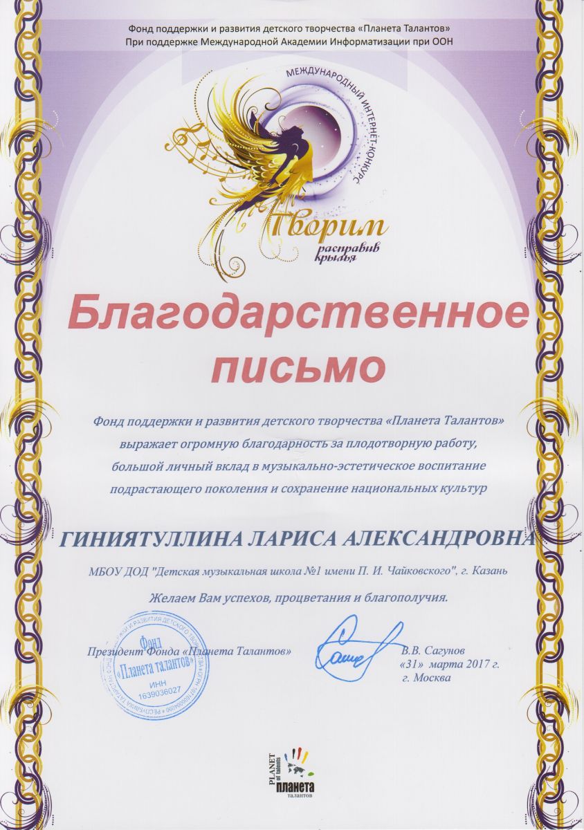 Городской конкурс юных пианистов "Музыкальная мозаика" - Ганиева Р.Д., Благодарственное письмо;