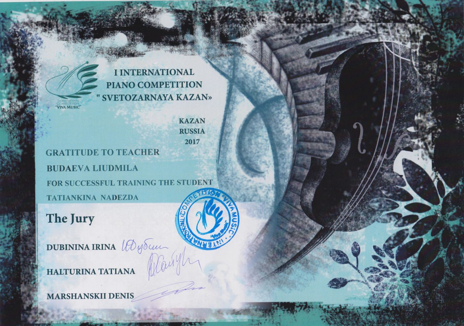 I Международный конкурс пианистов "Светозарная Казань" - Будаева Л.А., Благодарность;