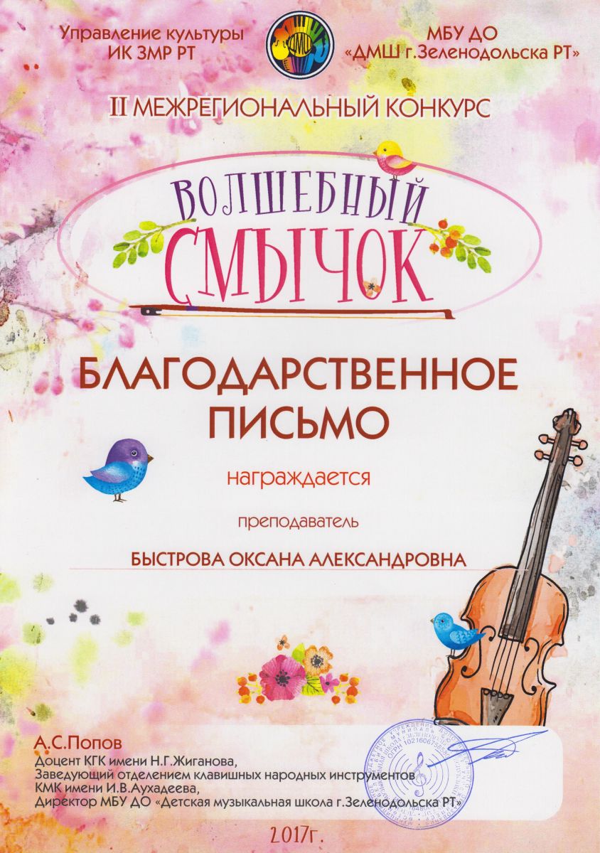 II Межрегиональный конкурс "Волшебный смычок" - Быстрова О.А., Благодарственное письмо;