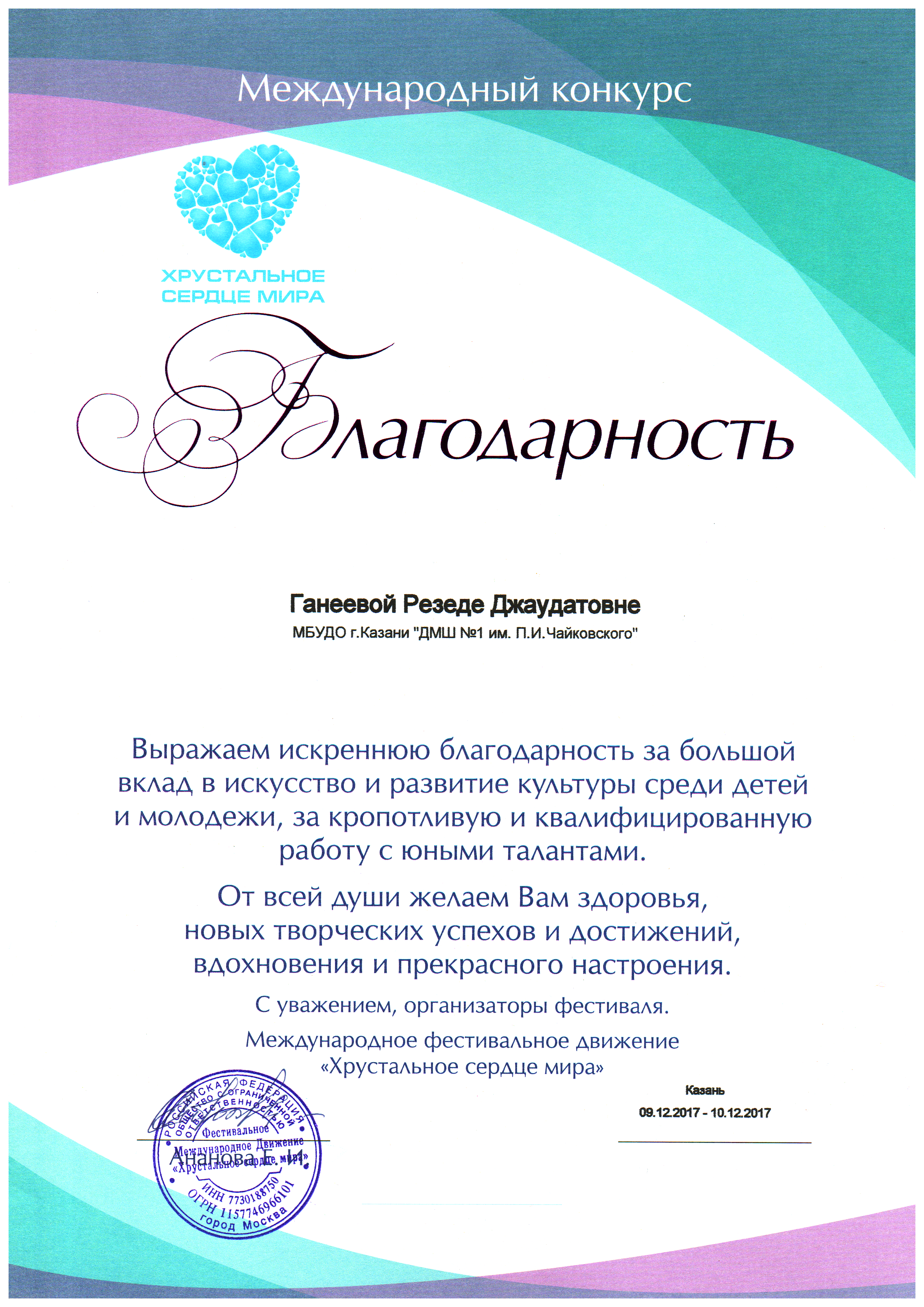 Международный конкурс "Хрустальное сердце мира" - Ганиева Р.Д., Благодарственное письмо;
