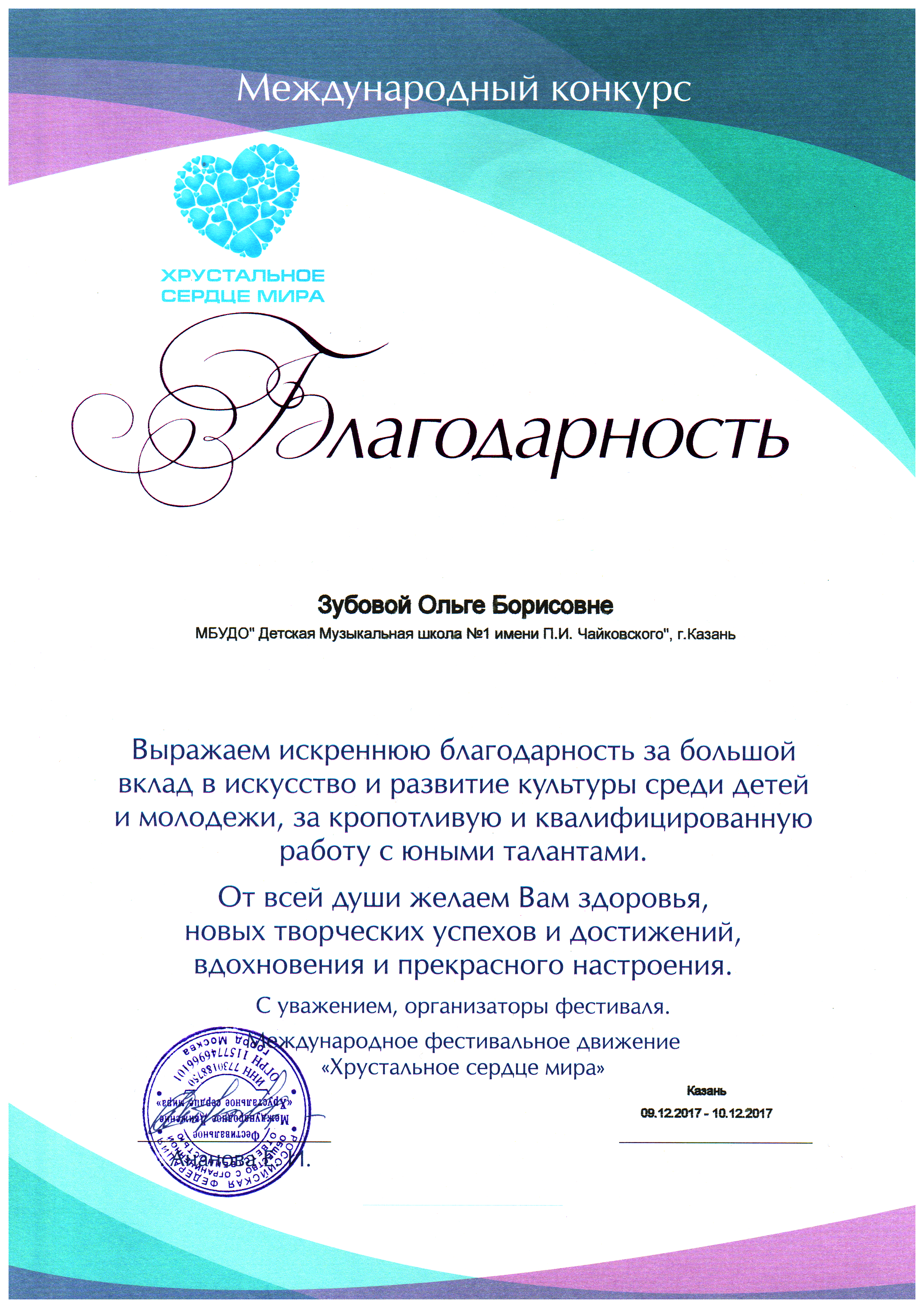 Международный конкурс "Хрустальное сердце мира" - Зубова О.Б., Благодарственное письмо;