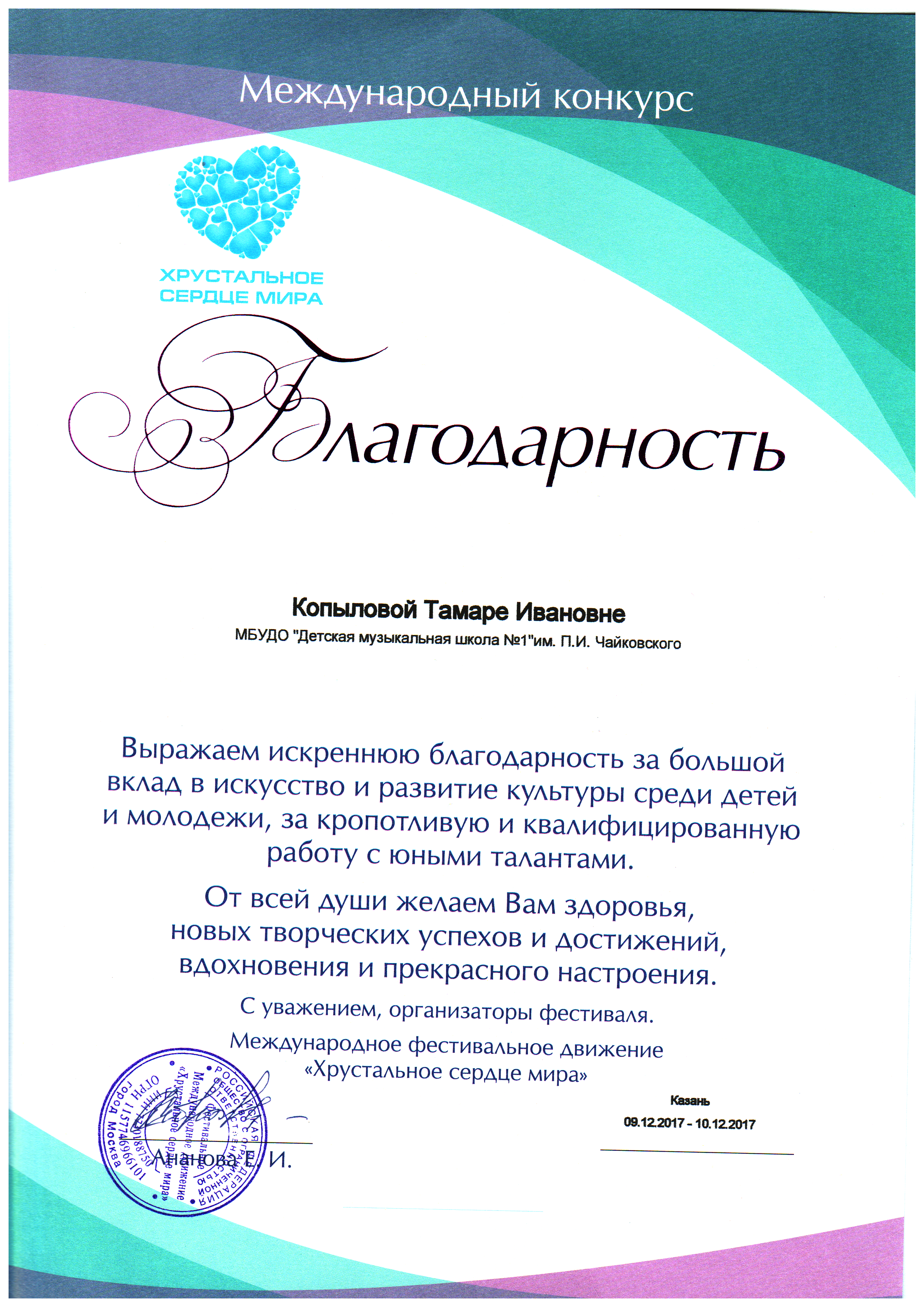 Международный конкурс "Хрустальное сердце мира" - Копылова Т.И., Благодарственное письмо;