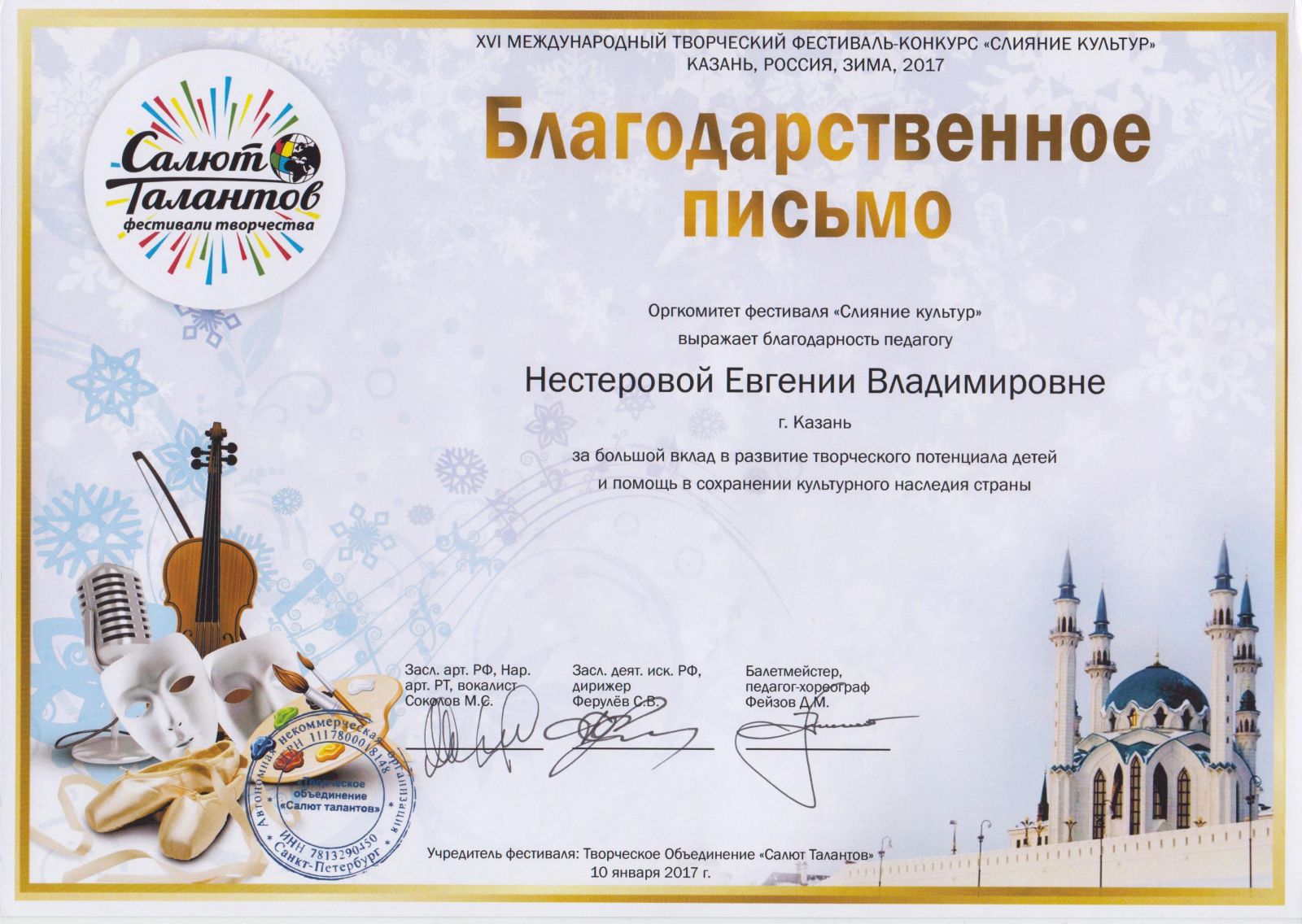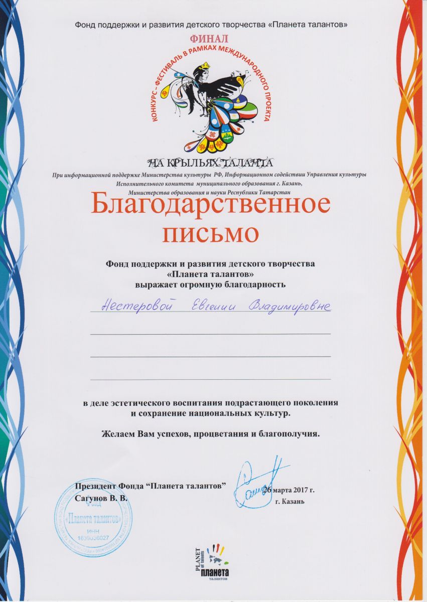 Международный проект "На крыльях таланта" - Нестерова Е.В., Благодарственное письмо;